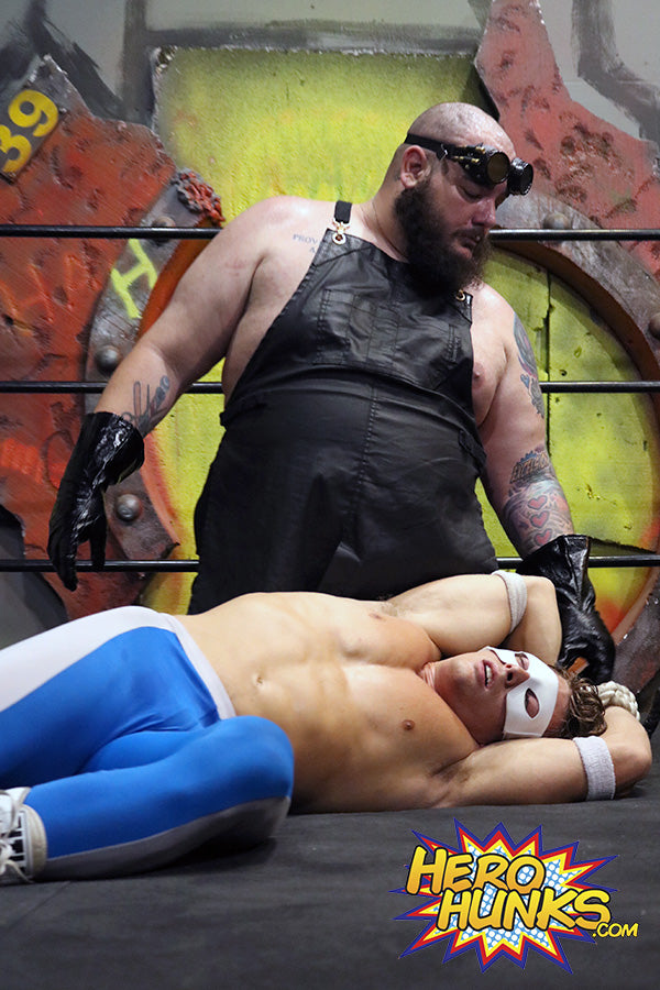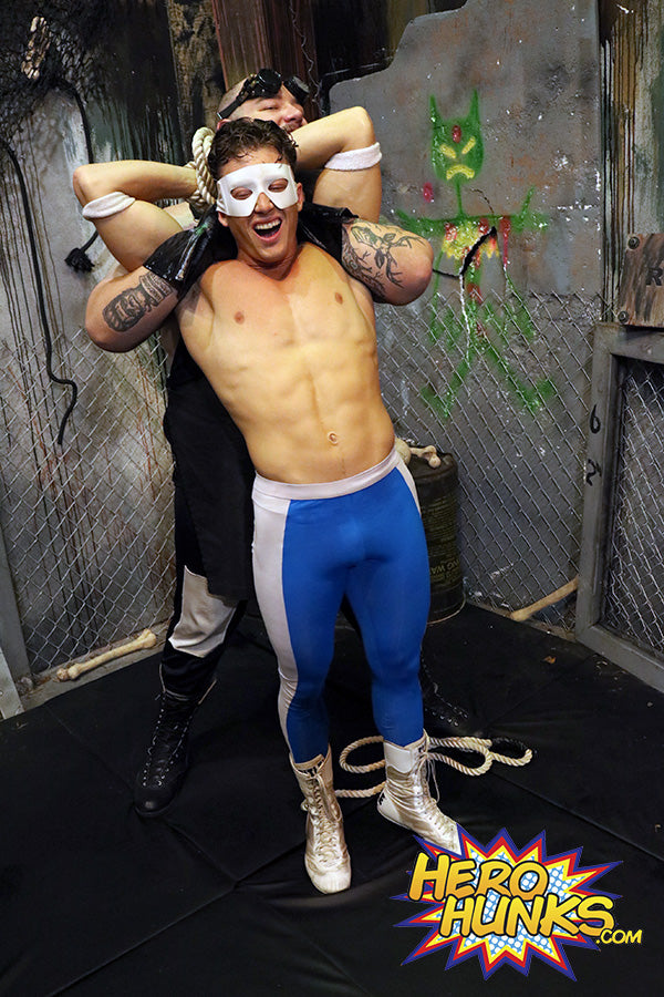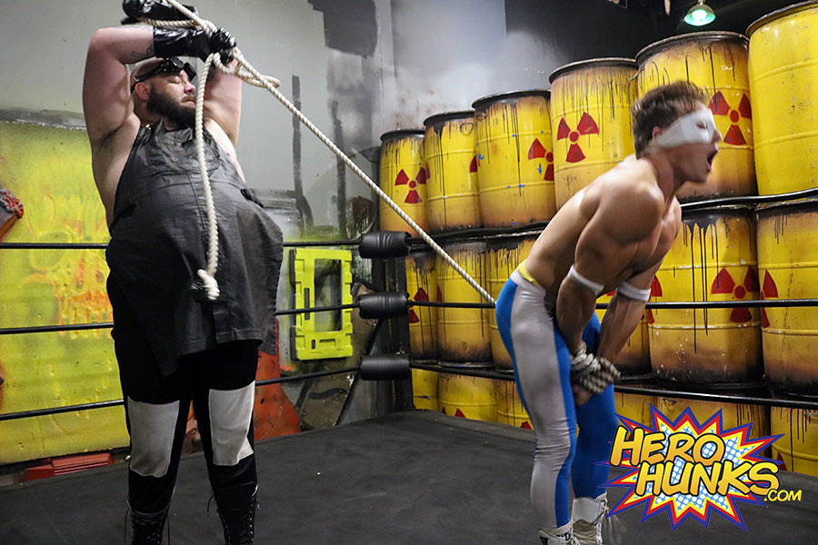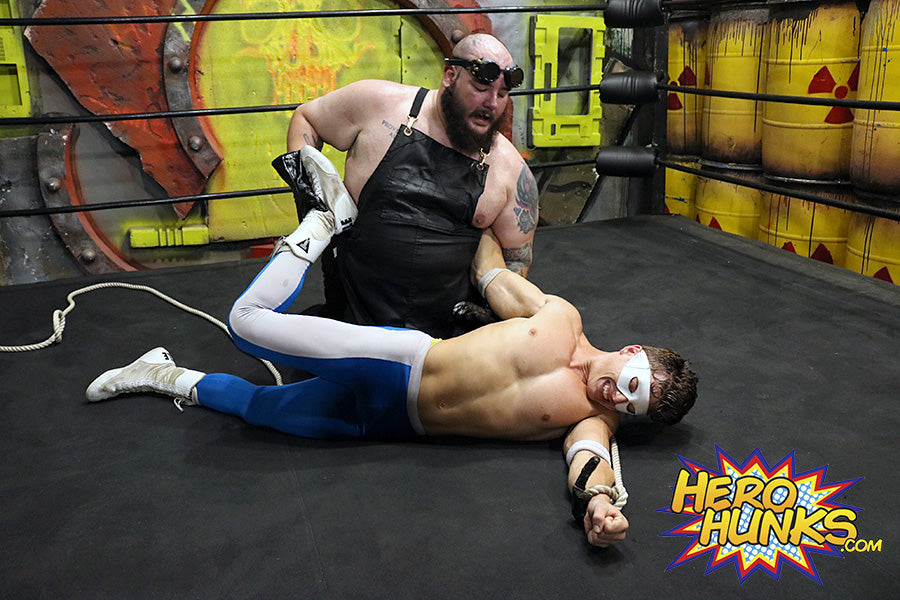 “On your knees, slave!” barks Dr. Maniacal with his trademark lisp. Spit flies as the massive, hairy, repulsive villain lisps his threats at the handsome White Wolf, who struggles against his bonds, and the clamping grip of Dr. M on his nipples. Dr. M moves down to White Wolf’s abs, pounding him hard, then digging his gloved fingers deep into White Wolf’s biceps.