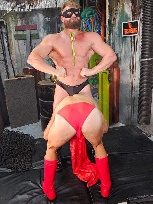An age of shadow vs. light, good vs. bad, hero vs. villain. This is Hero Hunks, where impossibly muscular bodies flex and pose in suits of Lycra and spandex, stretched tightly across muscular backs, chests, thighs, and more. Hero Hunks offers scheming villains, daring escapes, bitter rivalries, strength, domination, superpowers being used and abused, and, of course, heroes fighting for what’s right.
