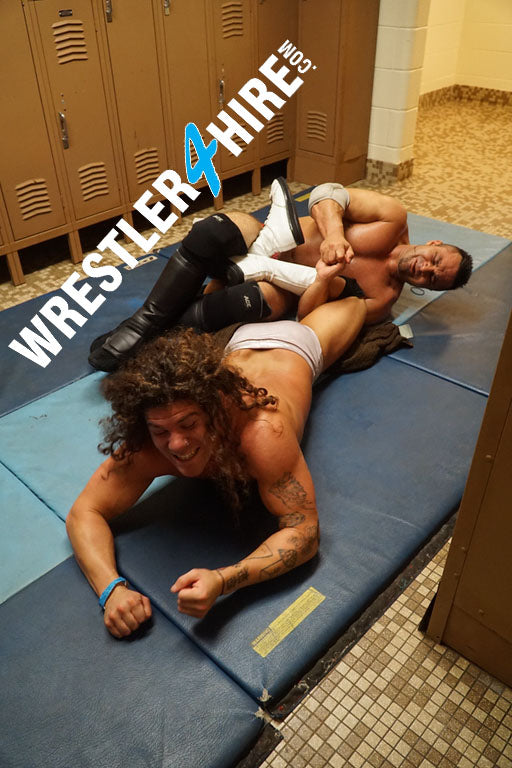 And since Ace hesitates a little too long in getting to the shower, Trouble is about to be unleashed again. Bashing Ace’s head into the lockers, Teddy stuns the boy, quickly getting Ace into a crushing head scissors. Teddy tries to explain to the straining Ace that he was just making a peace offering, “but now you’ve gone and made it weird.” With Ace’s head gripped hard between Teddy’s tree trunk thighs, Teddy follows that up with, “what’s between my legs can keep you down.” So, this match is definitely going to stay weird. Ace pretends to agree to the shower to get away, but he’s going nowhere. Teddy knows how to wield his towel to keep Ace trapped in pain. Ace can do nothing but scream and writhe in pain, as Teddy spreads those lithe, sinewy legs of Ace like a wishbone, and then drops a knee to the balls.