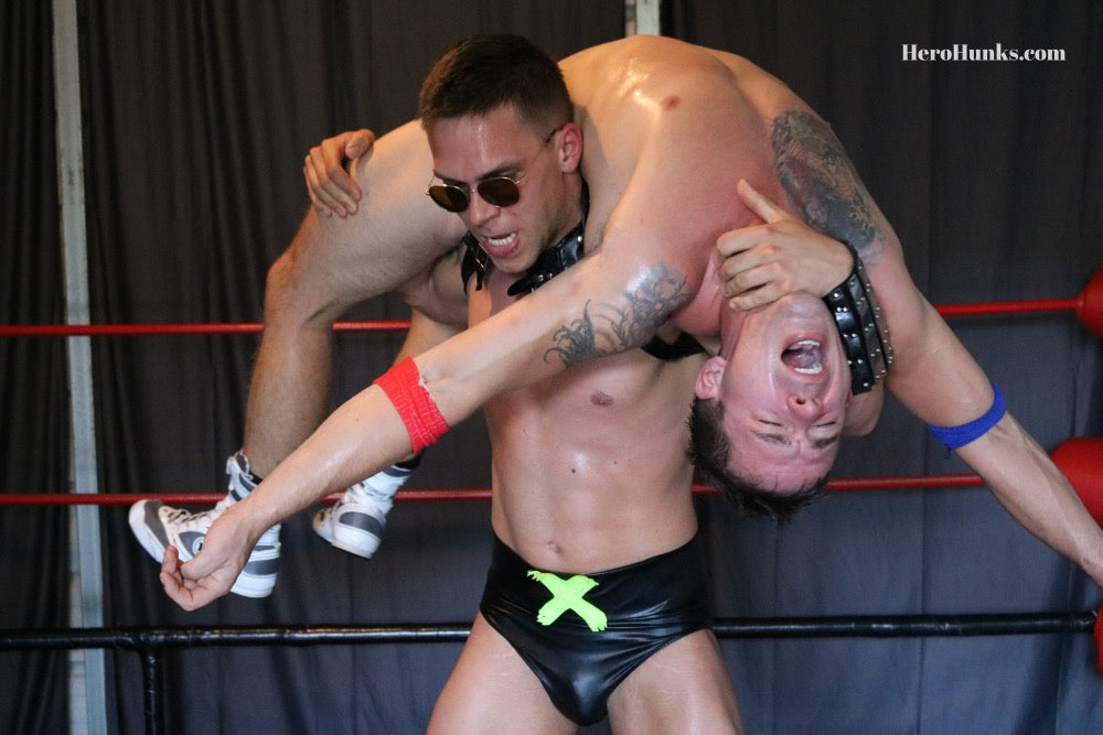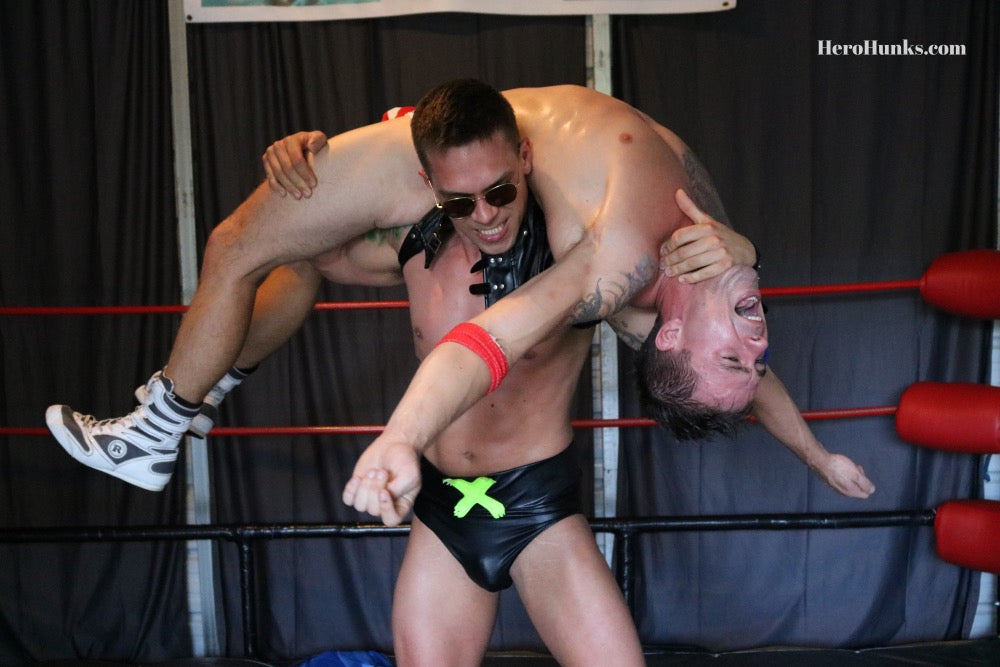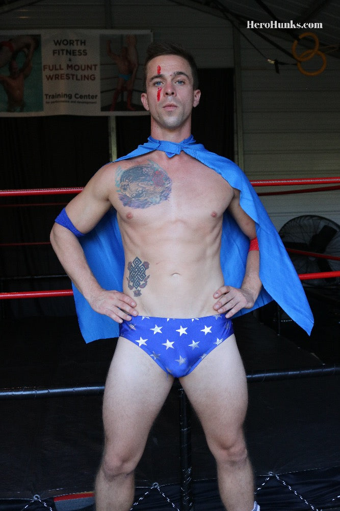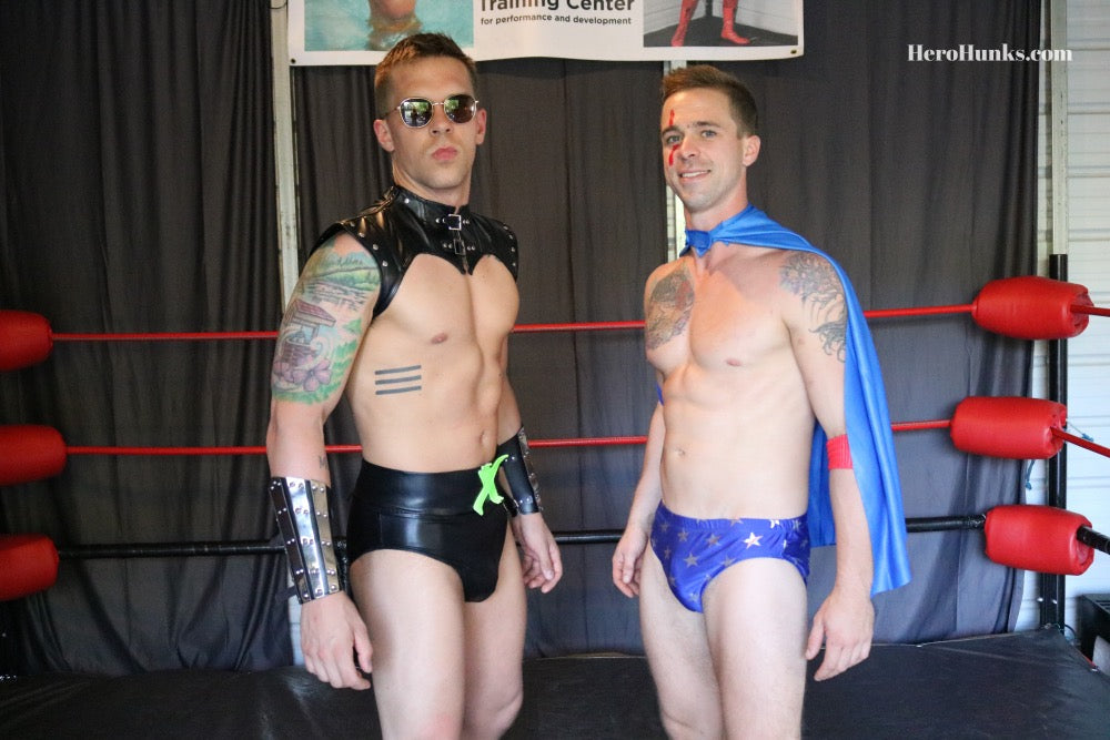 I've always thought of Elite Elliot as equally good at playing the toyed-with hero and the tormenting villain. This video, though, shows a new and twisted intensity to Elite's bad-guy-ness. Mind you, Tanner Ripley makes it easy. Shorter than Elite, but solid and nicely muscled, Ripley's portrayal is full of hands-on-hips hero earnestness. But Ripley's American Missile hero is maliciously and deliciously disarmed by Green Fang again . . . and again. It is impressive that Ripley resists as long as he can because Elite is an imposing figure in his wet-look black trunks. His legs seem to explode out of the leg bands, and the pouch of the trunks is packed pretty tight, too! For fans of Elite's elite, statue-like body; or fans of villains dismantling overconfident muscled heroes, this one's for you. FYI, sidekick Ripley gets STRIPPED of his star-spangled trunks to reveal a flag-themed thong. Easy to see that Ripley is full to bursting with 'patriotic pride.'
