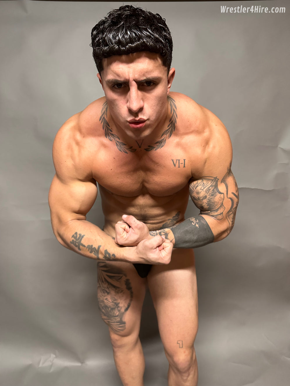 Amino is the biggest and strongest he’s ever been. It’s hard not to notice. His rock-hard body has filled out even more lately, each flex showing off the new muscle he’s added. He’s invited his friend Alberto to try out for Wrestler4Hire. Alberto’s handsome, well-built, and barely covered in his metallic blue bikini. Hard to believe he’s a little shy about his gear, but when the red light on the camera flicks on, he stumbles over his introduction. No big deal—you can’t hide what’s real.