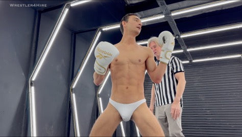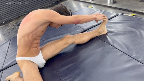 Austin NRG is fresh to the wrestling scene, but he arrives with a body that demands attention—perhaps the most incredible set of abs on any athlete to ever step onto the mat. He’s lean, ripped, and dangerously flexible, starting his warm-up routine with an eye-catching stretch that highlights every chiseled inch of his youthful frame. Clad in a crisp white thong, he bends effortlessly into a flawless back bridge, his bulge straining against the spandex, a perfect preview of the action to come.