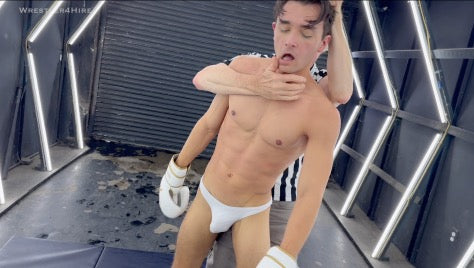 Brock isn’t just a ref—he’s an old-school heel who hung up his boots long ago, but the thrill of fresh meat is too much to resist. And now, Austin is his. Pinned against the wall, his flawless abs take punishing gut punches as Brock taunts him. The fury of punches weakens the nearly impenetrable abs of the young stud.