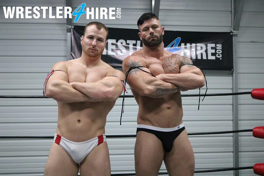 Austin Cooper is as sexy as ever and is even sporting a little facial scruff to add to his sex appeal. He’s wearing white boots and white trunks with red trim. This man has timeless handsome looks that help add to his loyal fan base. Joey Nux is tall, handsome and built like a rock. With his huge muscles, black boots, and black trunks with white trim, he’s quite intimidating. Austin is well-built and very strong, but Joey towers over him. Austin has significant wrestling experience on the mats as well as in the ring, but this guy is like a lumberjack.
