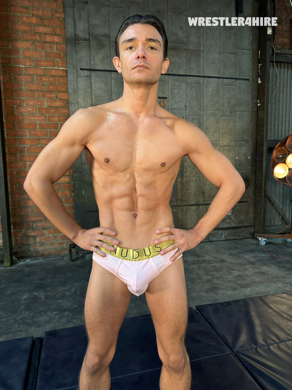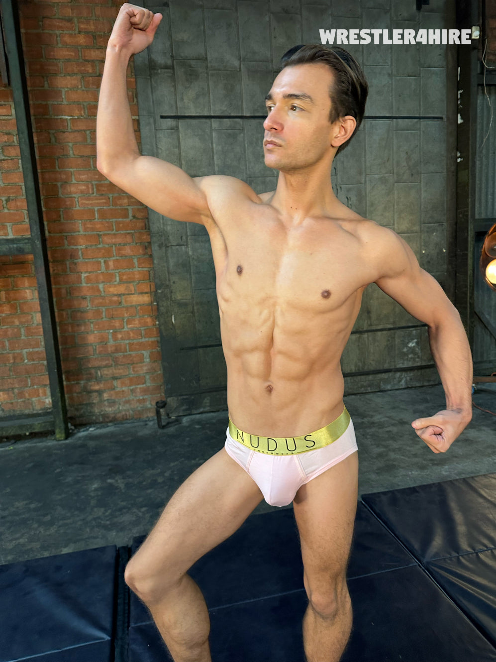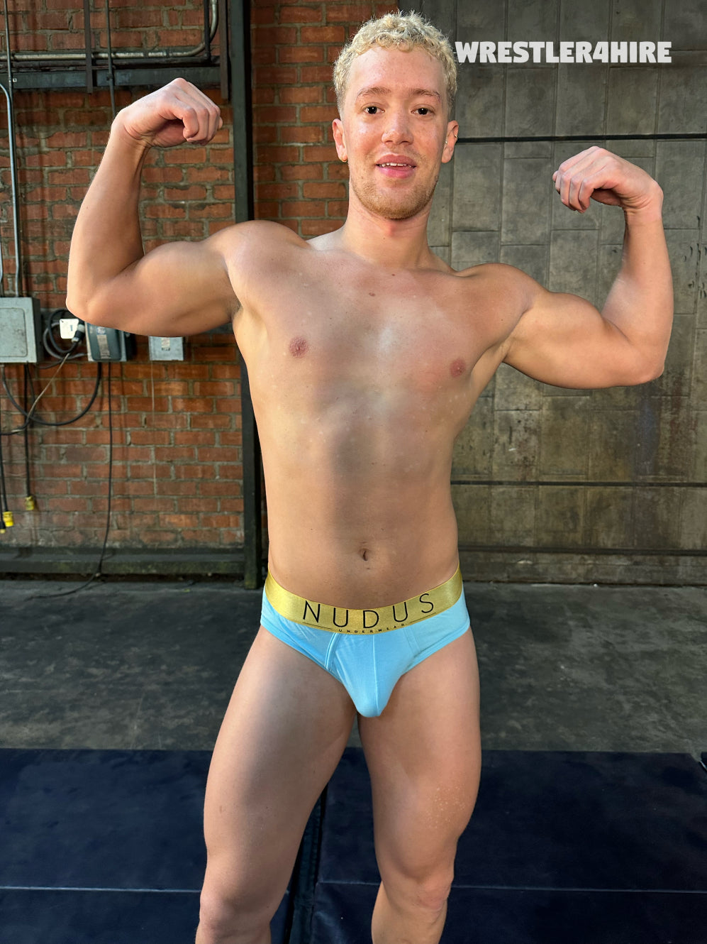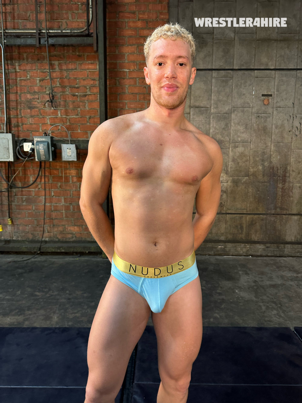 Now, the blue brief wearing blonde lies on his back inviting his shredded friend Austin NRG into the same predictament. How long can he last in this painful and humiliating face-to-crotch headscissor hold? The two exchange headscissors back-and-forth numerous times with each aiming to make the other submit more quickly than previous. When headscissors aren't enough they resort to atomic wedgies. Underwear is pulled and stretched to its limit as butt cheeks are split beautifully.