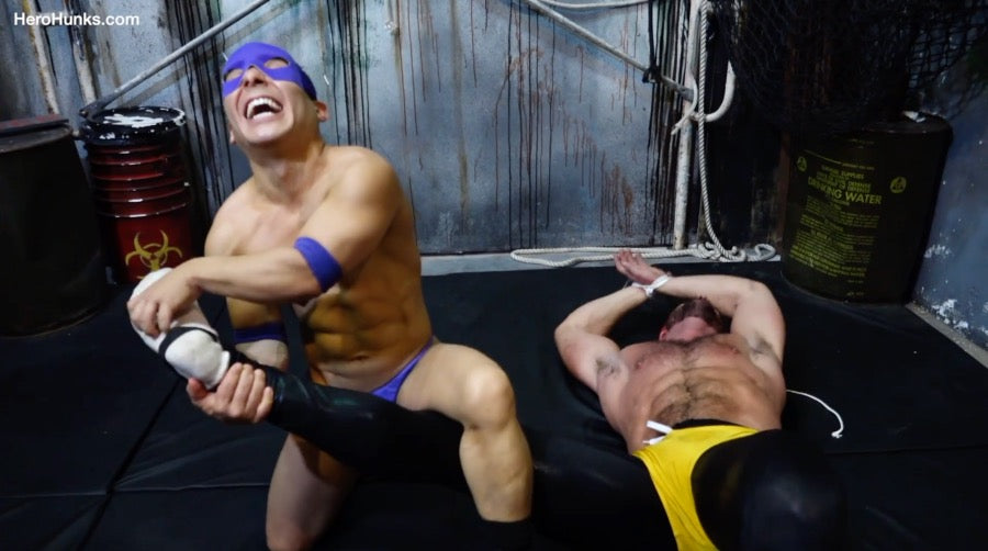 Badcock ties his opponents feet together so the the hero is hog-tied and prone for more punishment at the little hands of a true hero hater!