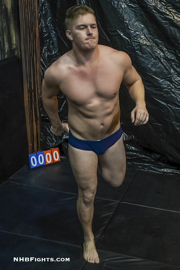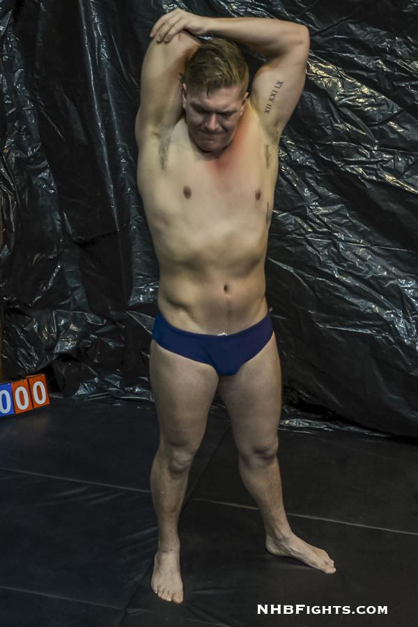It’s always fun to see two dudes with very different body types fight it out. That’s the exciting thing about a no holds barred match, there are many variables and uncertainties to consider. In many ways, intelligence is every bit as important as strength or speed. Lean, occasionally temperamental Blake Starr faces off against beefy, cool Drew Harper, and from the moment their bodies connect it’s a rough scrap. Both men are instantly red in the face and gasping as they strain for the first advantage, rolling all over each other in a wild struggle.