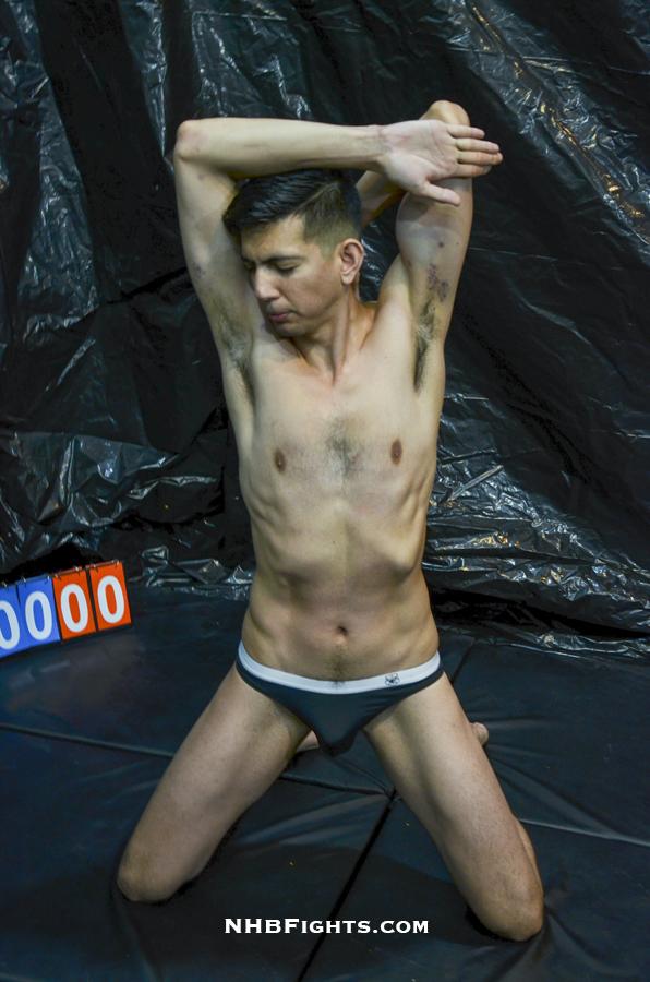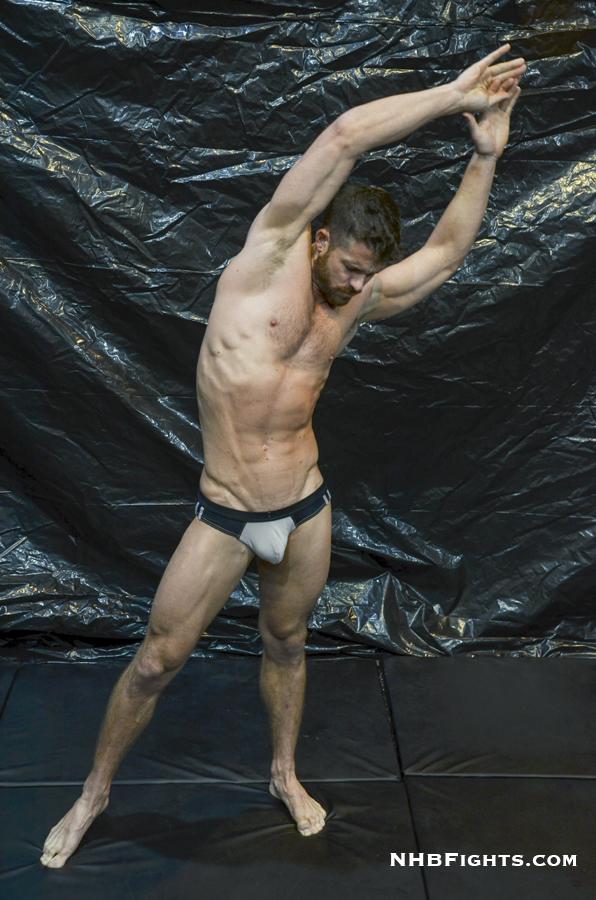 Long legs coil and twist like snakes, ankles lock, arms crush windpipes, and veins pop out as each man fights with everything he’s got. They circle like cats about to pounce, then quickly tangle up so tightly it’s almost impossible to tell where one man begins and the other ends. Black and white speedos press together or are pulled for leverage. At one point Blake is wedgied so hard it’s hard to watch. Grunting and groaning, hands grasp at faces or twist arms in desperate exertions designed to gain power. Face-to-face, these grapplers glare at one another, sleeper, and struggle to get up after every tap. Their breathing becomes ragged as the war continues, building all the way to a showing of extremely poor sportsmanship toward the end in an uncalled for kick while one man is sitting down before the next lockup. The kicked man tosses the score cards in a rage and both men go at it with newfound hatred, ignoring the timer that signifies the end of the match. One man slaps the other’s chest hard, hissing “You’re lucky time’s up!” This duo definitely needs a rematch to settle their differences.
