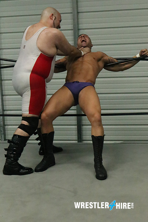 Donnie ties Braden in the ropes for some “ring positioning” lessons. The onslaught Braden suffers is unbelievable, both physical and verbal. Donnie has no intention of going easy on Braden and leaves him tied in the ropes for the remainder of the match, suffering in one humiliating hold after another, until eventually being sleepered and left hanging in the ropes. Donnie may not have the physique of Braden (which of us does?), but he is clearly the superior wrestler. The humiliation Braden suffers makes us worry that he’ll quit wrestling here at W4H. Until that decision is made, we are going to rename Donnie Dukes to The Triple D. It can stand for Dirty Donnie Dukes or Diabolical Donnie Dukes. Any thoughts on that?