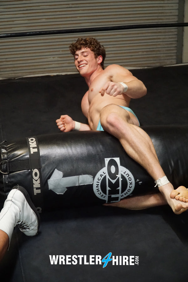 It’s a dramatic back-and-forth session that sees Scrappy leg scissoring Charron’s head while hanging from the corner ropes, or flexing over his fallen body while crushing his back with those epic thighs. Scrappy is bearhugged. Charron is plugged against a sparring bag, then crushed with it. Scrappy straddles the bag, as Charron gasps in desperation. Who will come out on top? Young stud, or mature mauler?