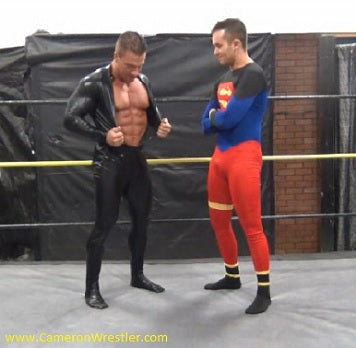 This Fantasy Fight begins with Braden Charron laying on his back in the wrestling ring. He's contemplating something, but what exactly? Braden moves into some stretching and a posing routine, when Superman (Ty Alexander) shows up perched on the top rope and quietly eyeing the bodybuilder. The two men are chest-to-chest. Braden continues to show off his body to Ty.