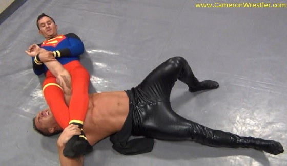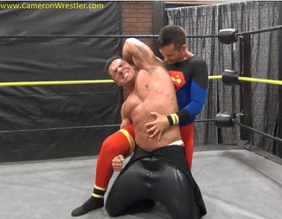 Braden finally finds some light when he powers out of a second upside-down hanging face-to-crotch headscissor. Ty is quickly stripped of his Superman suit and Clark Kent is revealed in a purple speedo. The attack goes to the back. Camel clutch, over-the-knee backbreakers, body slams and, effortless, hip tosses.