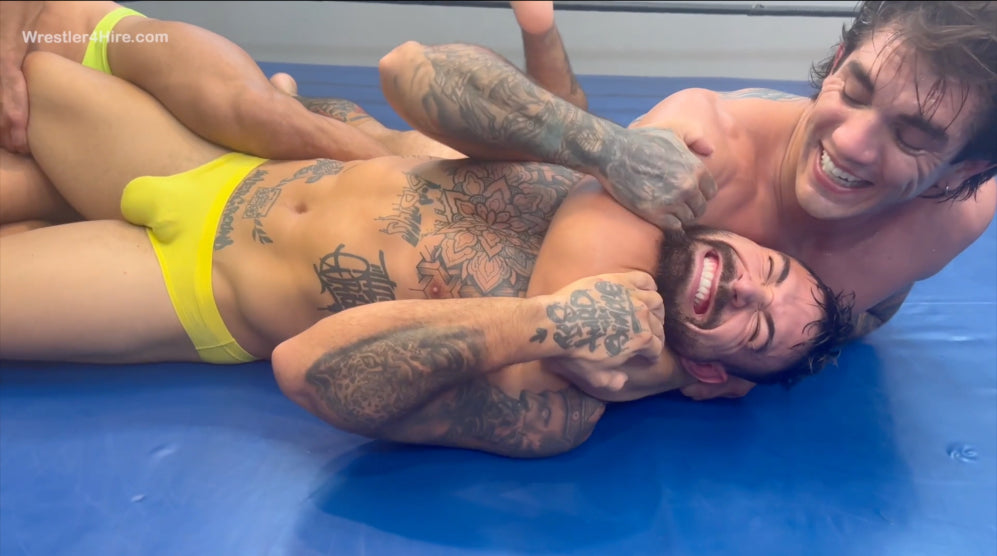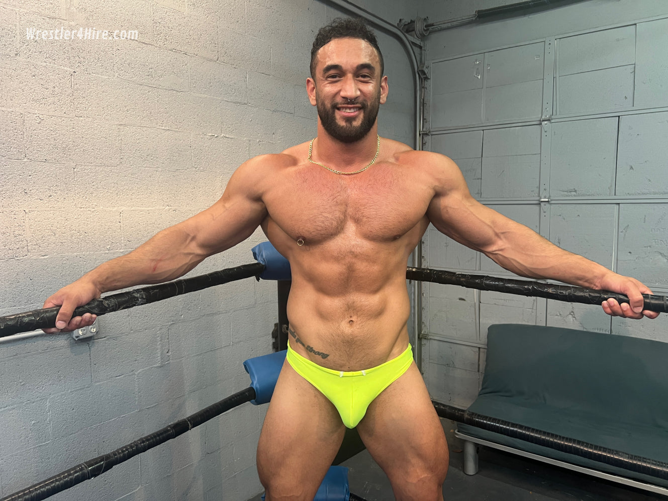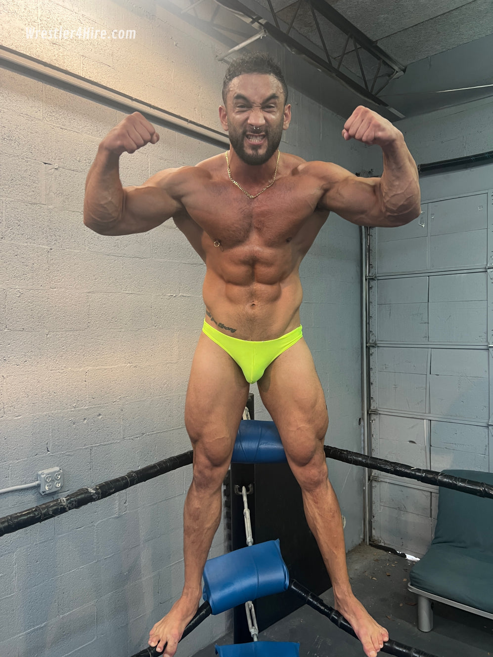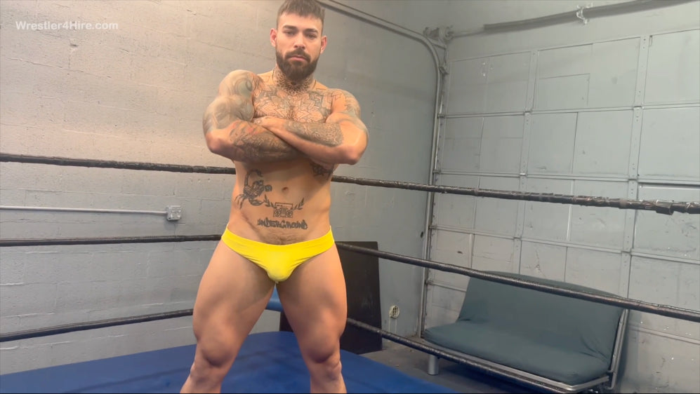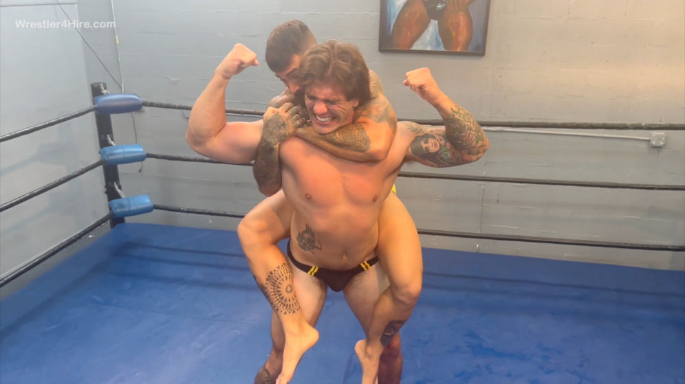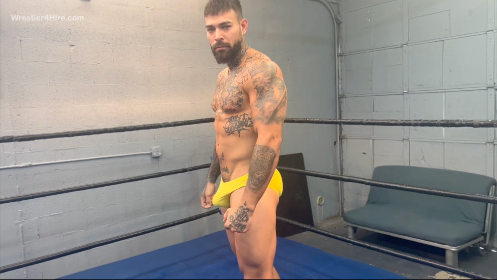 What started as friendly fun quickly turns into a energetic free-for-all. It’s two-on-one, and then every man for himself as loyalty goes out the window. The ring fills with grunts, ass slaps and playful trash talk. Trunks are yanked up muscled ass cracks and The Shaft's pierced nipples are twisted.