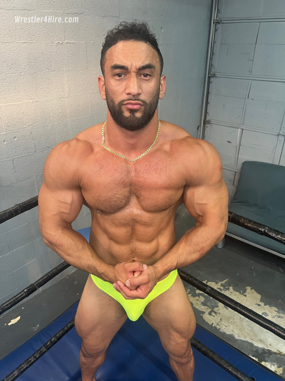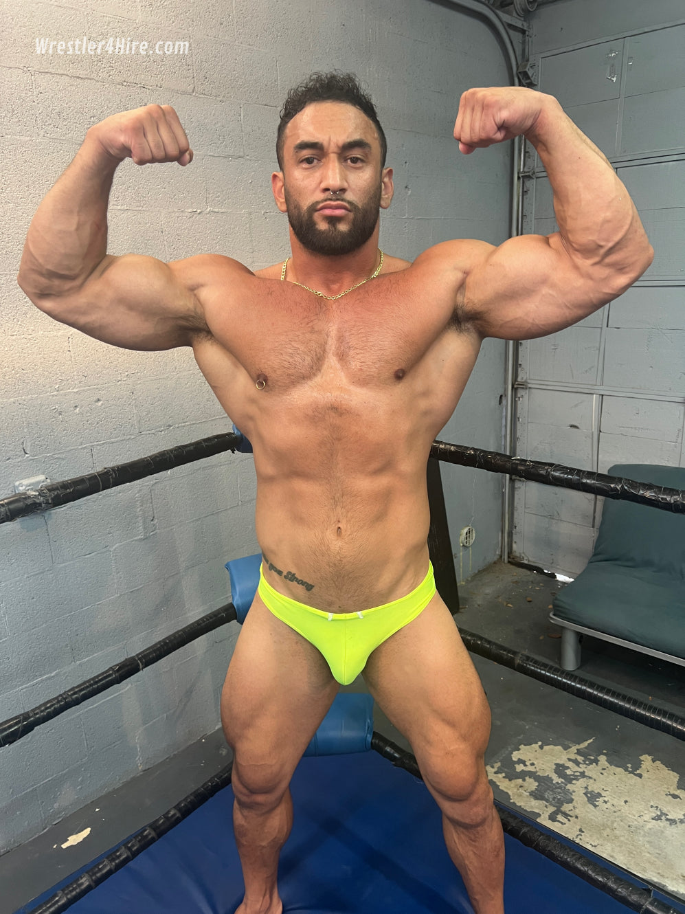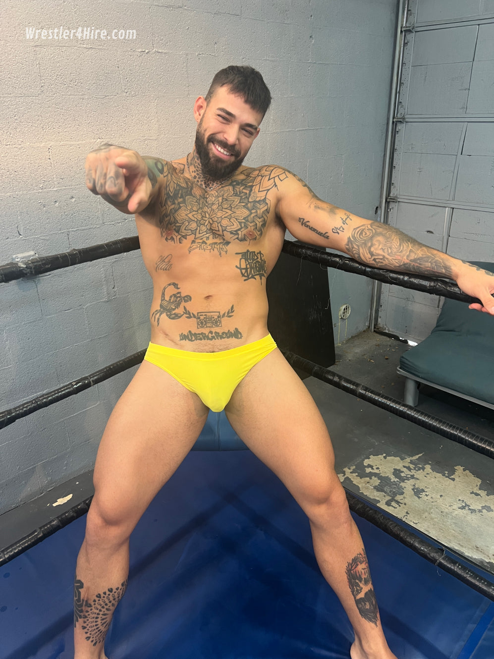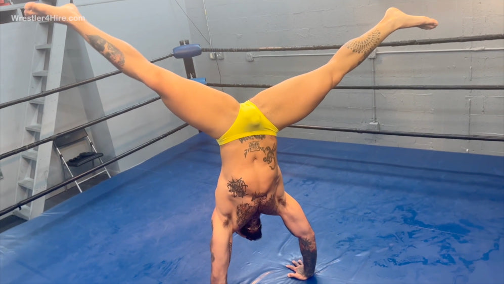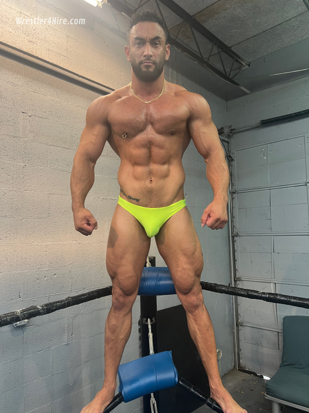 What started as friendly fun quickly turns into a energetic free-for-all. It’s two-on-one, and then every man for himself as loyalty goes out the window. The ring fills with grunts, ass slaps and playful trash talk. Trunks are yanked up muscled ass cracks and The Shaft's pierced nipples are twisted.