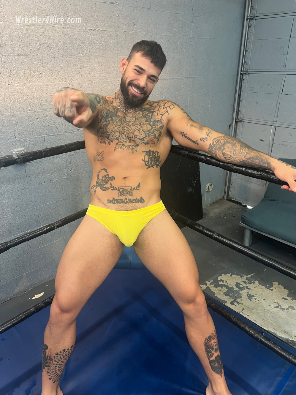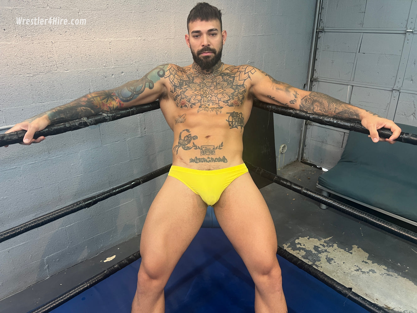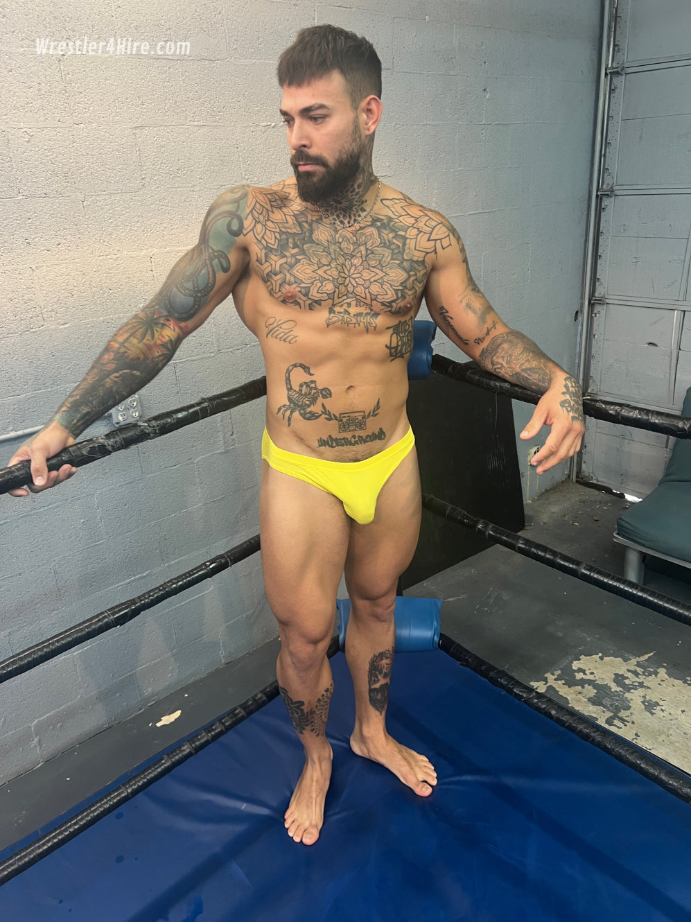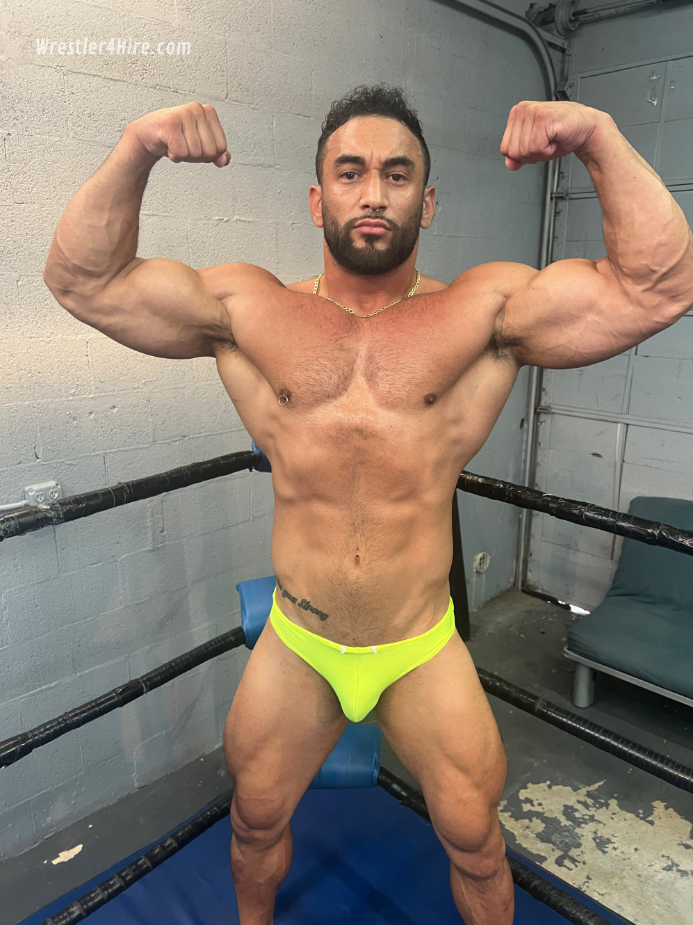 What started as friendly fun quickly turns into a energetic free-for-all. It’s two-on-one, and then every man for himself as loyalty goes out the window. The ring fills with grunts, ass slaps and playful trash talk. Trunks are yanked up muscled ass cracks and The Shaft's pierced nipples are twisted.