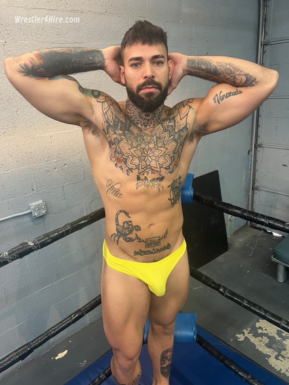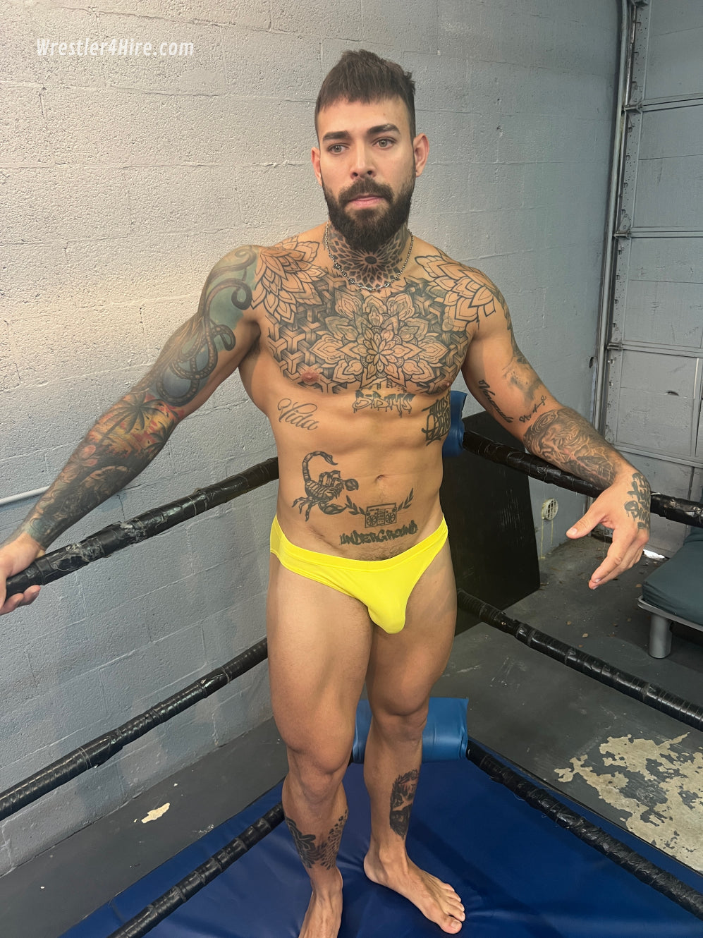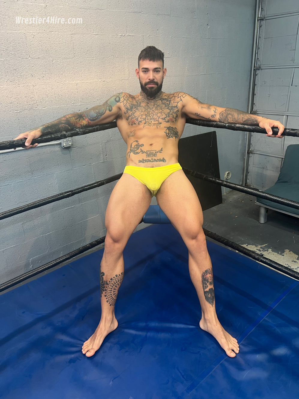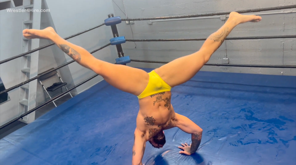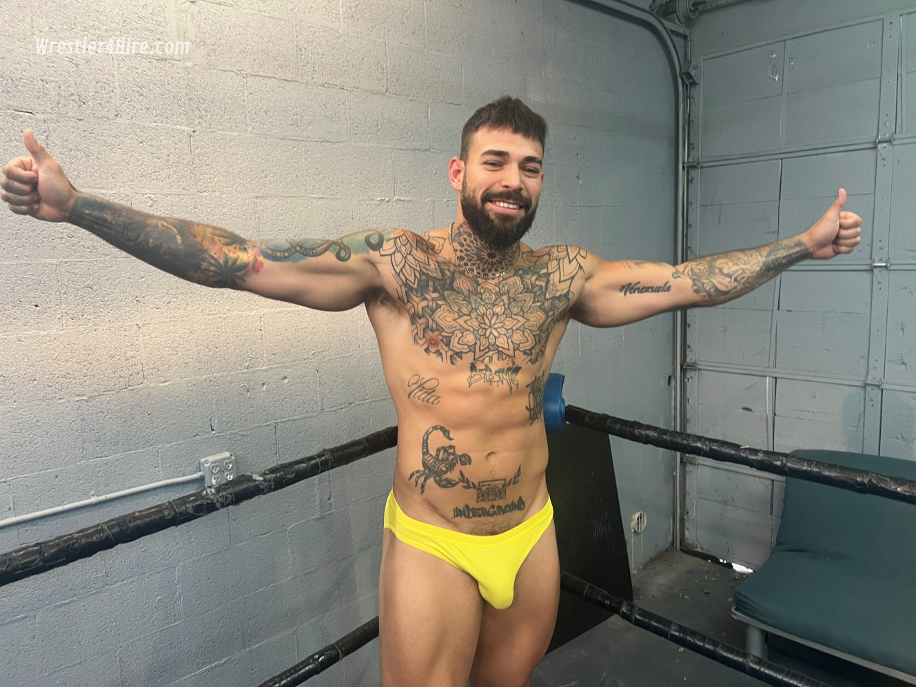 What started as friendly fun quickly turns into a energetic free-for-all. It’s two-on-one, and then every man for himself as loyalty goes out the window. The ring fills with grunts, ass slaps and playful trash talk. Trunks are yanked up muscled ass cracks and The Shaft's pierced nipples are twisted.