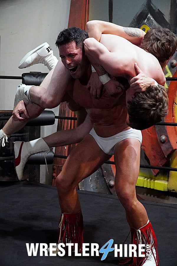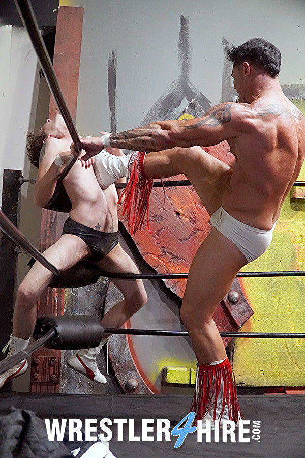 I press one of the punks into the corner with my boot in his neck, toss him around, drag him by his ankles, and yank him up by his hair, all while Joey twists the other one’s arm and grinds his armpit in the punk’s face. We go to town on their abs, then toss them on top of each other mid ring. Then I get a brilliant idea! Time to lace their legs together and sit on them while Joey tortures them by cranking them up by their chins and hair.