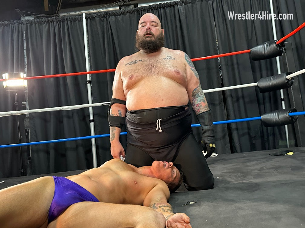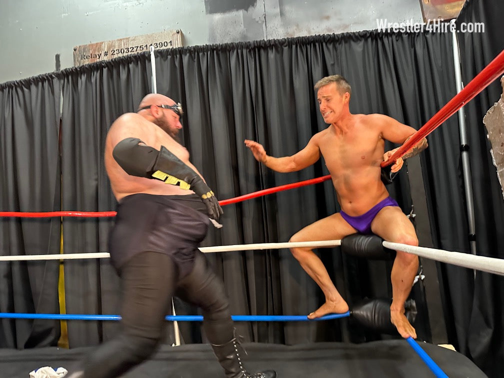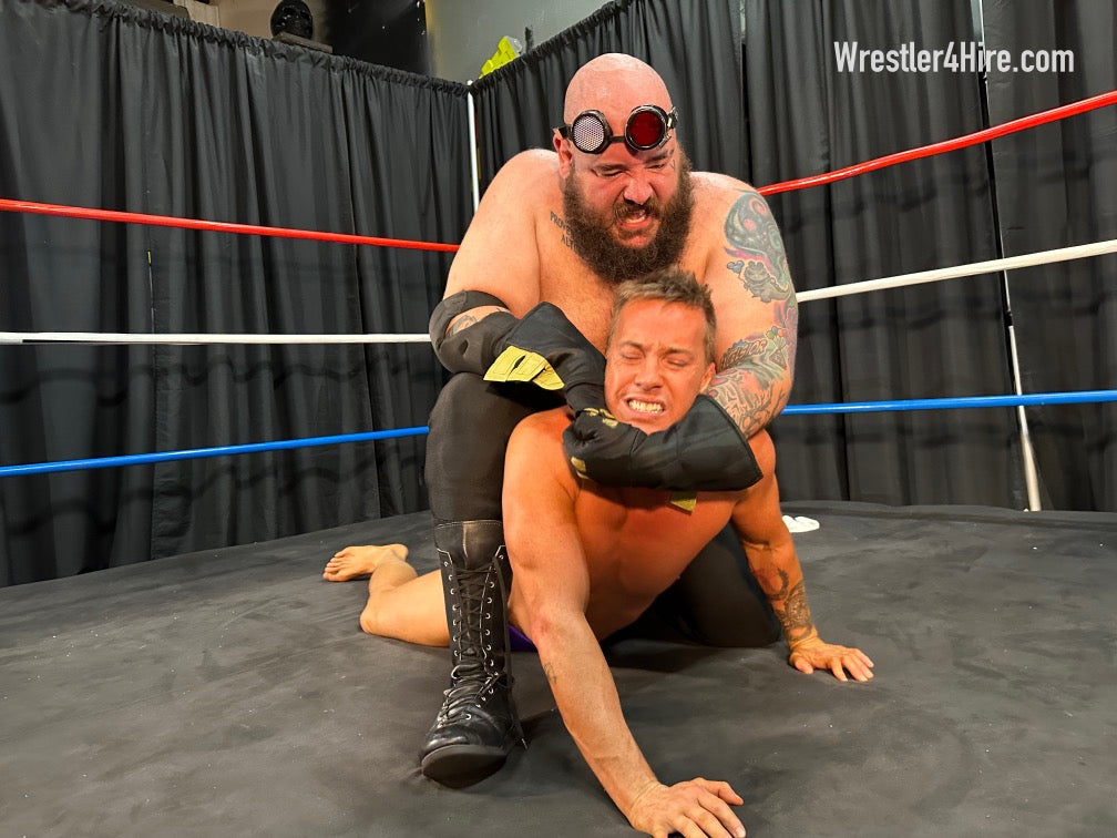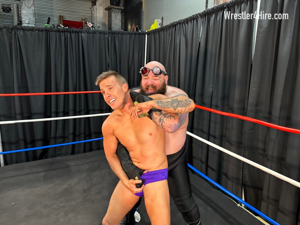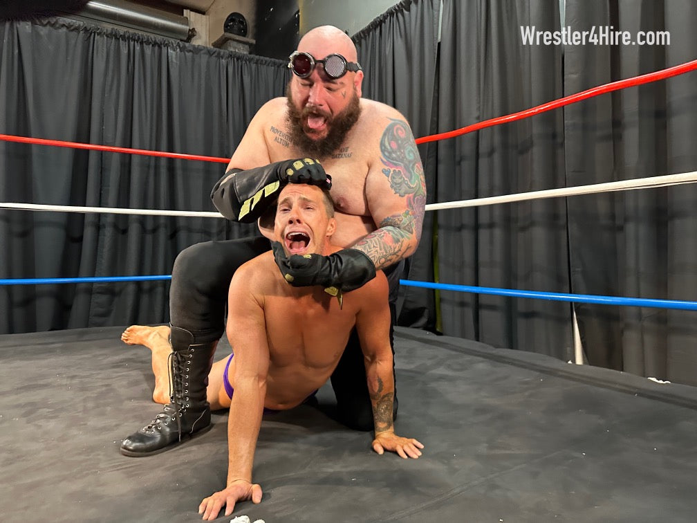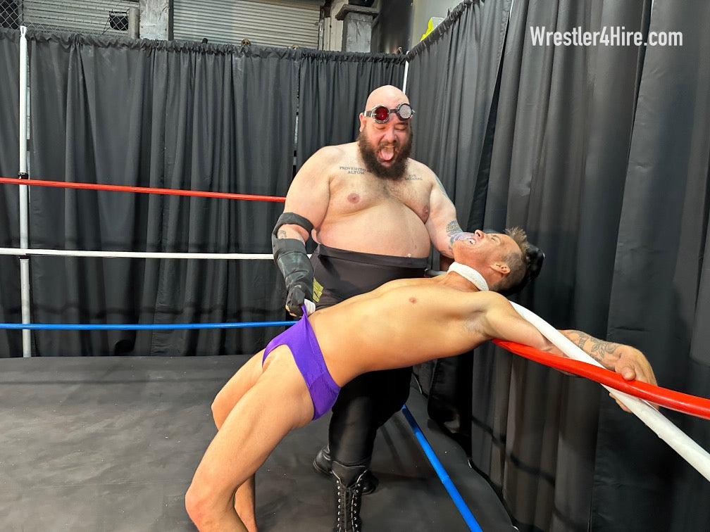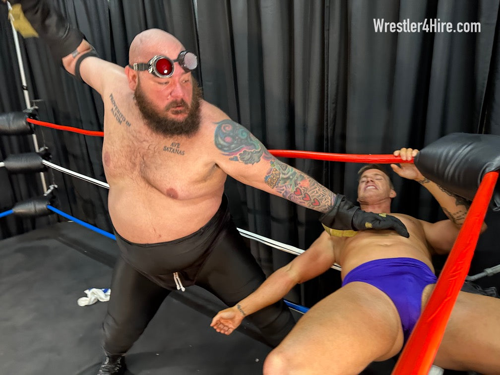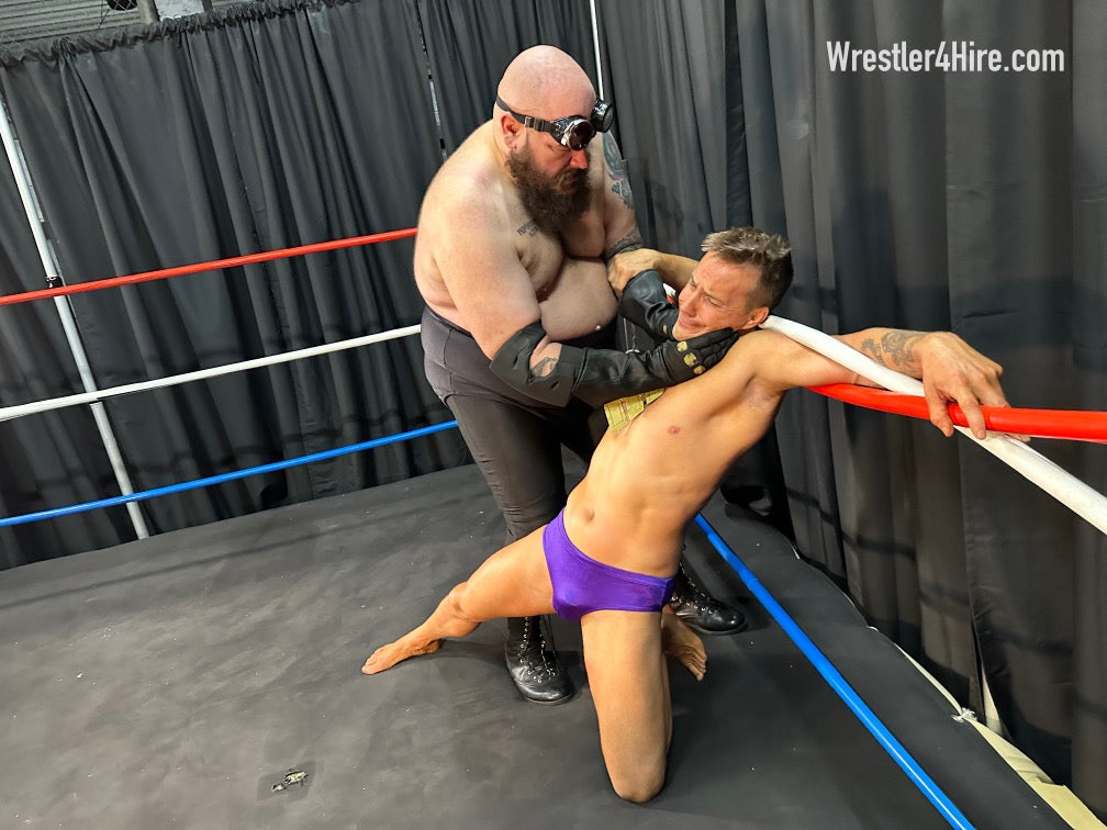 Boots to Cameron's groin add another brutal touch, and the full nelson that follows stretches him out with all the power Maniacal can muster. Hoisted into the corner, Cameron’s straddled over the ropes, a prime target for clawed abs and more ruthless low blows. Soon enough, Maniacal locks in a sleeper hold, slowly draining the life out of the Cameron.
