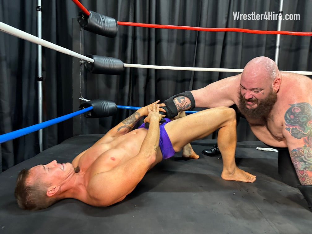 Dr. Maniacal delights in waking Cameron just to punish him further. A few harsh fists to the gut reveal Cam’s vulnerable side, each groan growing louder once the mouth plug is removed. You can practically hear the Champ’s pleas, though there’s no mercy here. Untying him from the ropes, the villain takes his time, working over Cameron's body with a cruel sit-down on his lower back, twisting his head until the pain is unbearable with a camel clutch.