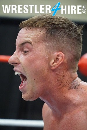 6 FOOT 4 INCH, Bomb Bower is also known as the “tit ripper,” and he puts Cameron through a bit of nipple torture. But apart from dirty moves, he knows his way around the ring. He probably did a lot of damage to opponents in his leaner years. Even when Cameron gets the upper hand with an off-the-top-rope leg scissors, his dominance is short lived. Winded, Bower welcomes Teddy Trouble to the ring. Longtime fans know why Teddy is named Trouble. He’s got the moves and the mean streak.