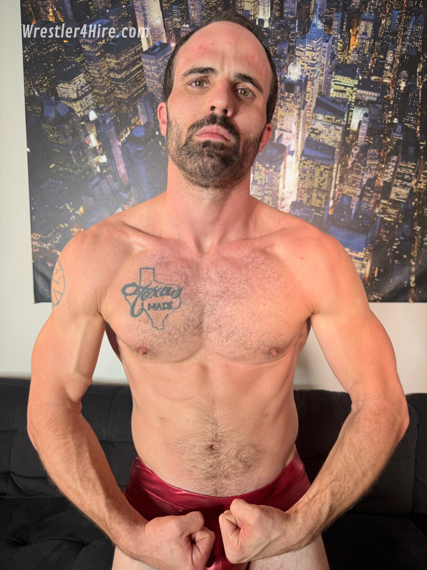 If there’s one thing Cash is built for (and he’s built for a lot), it’s lifting heavy and looking like a damn statue while doing it. This bout opens with Cash pumping 25-pound dumbbells, veins rising under his tanned skin, his pecs flexing with each curl. His thick, hairy chest and dusting of abs glisten with sweat under the lights, his green glitter speedo framing a well-proportioned bulge. The camera lingers—slow, deliberate—on the ridges of muscle and coarse hair that make him look every bit the alpha.