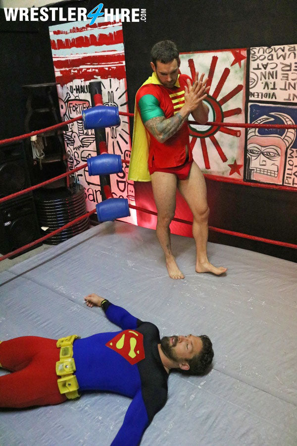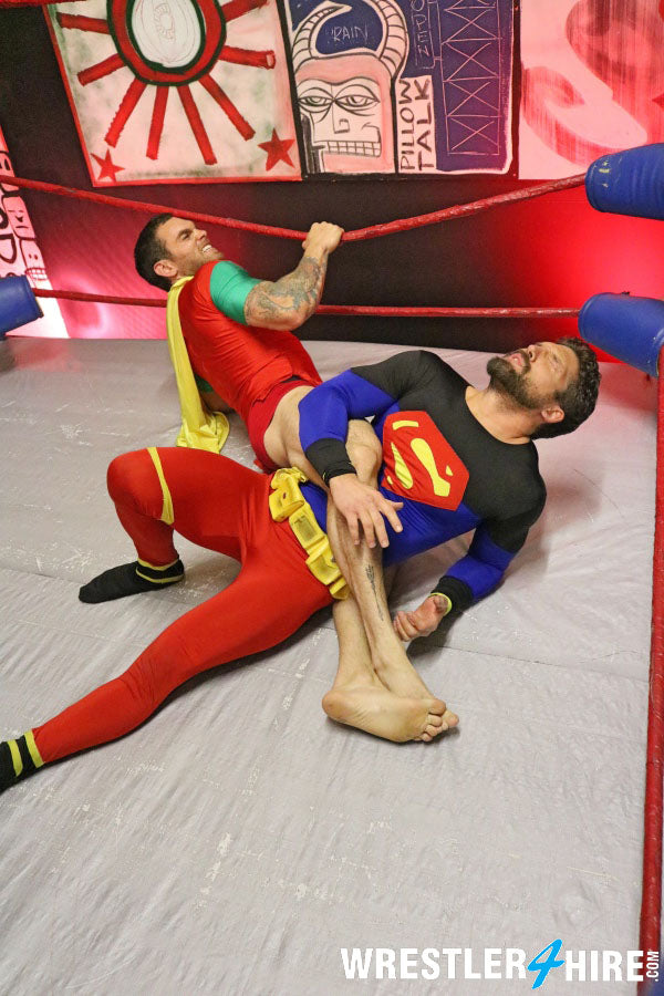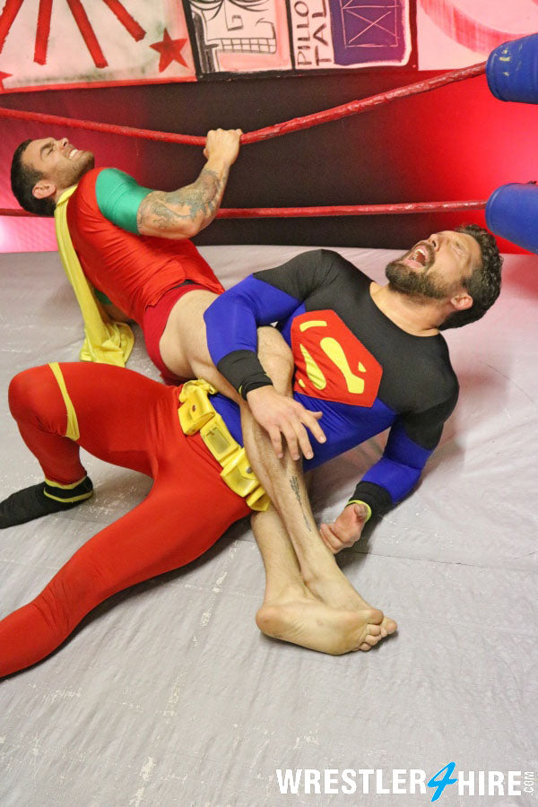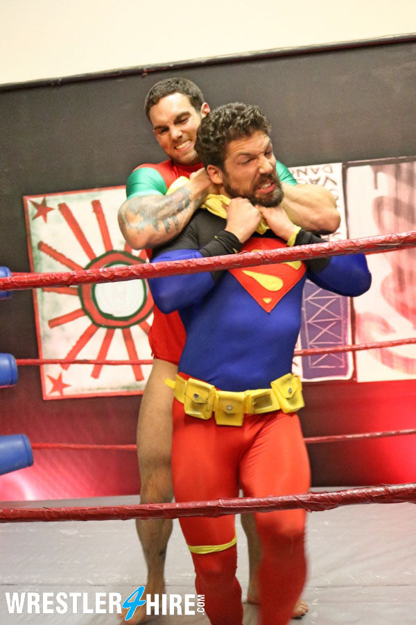 Bespectacled Ronnie Pearl can’t imagine a world in which a noted hero would turn to the dark side. But a barefoot boy wonder (more like “man wonder”, in the muscular form of Chace LaChance) is all too happy to prove this Daily Planet reporter wrong. A dose of drowsy dust does the trick, and suddenly Pearl is revealed to be the Man of Steel, only not so steely. It’s a one-sided battle of supremacy, as Man Wonder uses ropes those impressive arms to put on the nastiest headlocks, armbars, and sleeper holds.
