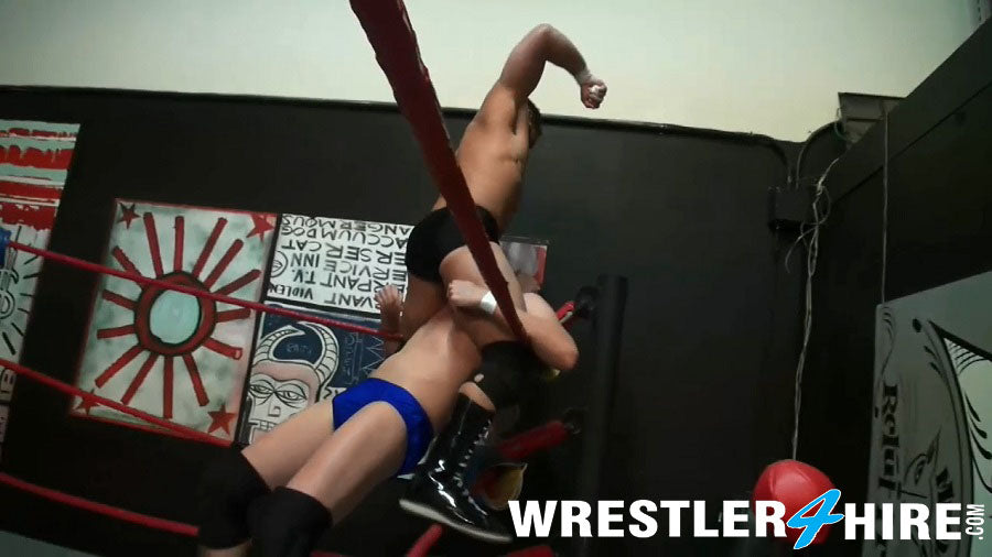 Chase is a technical wrestling master and has counter holds for just about every position he finds himself in, but that’s not enough to prevail over his more aggressive and much larger foe. Josh uses classic dirty tactics (eye gouges, chokes, sneak attacks) and gut punches to weaken Chase.