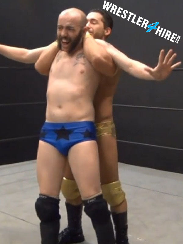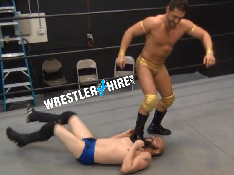 Chase Sinn is the goldenboy of wrestling, which he makes more than apparent in his shimmering, ass-embracing trunks, knee pads, and arm garters. He’s not a simple man, this hard-bodied hunk, with his decorative language choices, polished looks, and product-laden coiffure. Wayne the Jobber is equally hot, but comes at his hotness from a completely different angle. This dude ain’t trying to impress nobody! He doesn’t have to. He backs it up with his wrestling. Or does he?