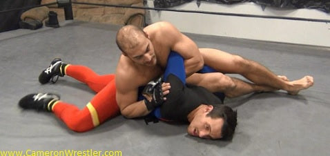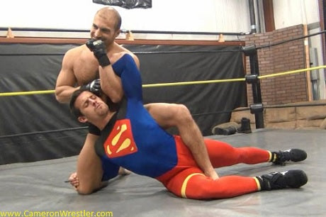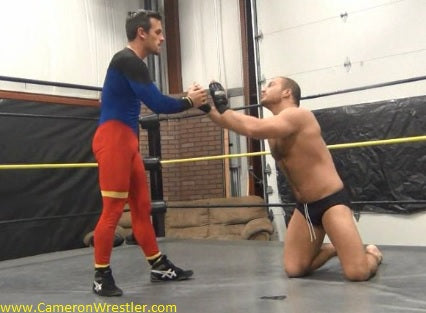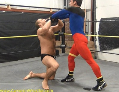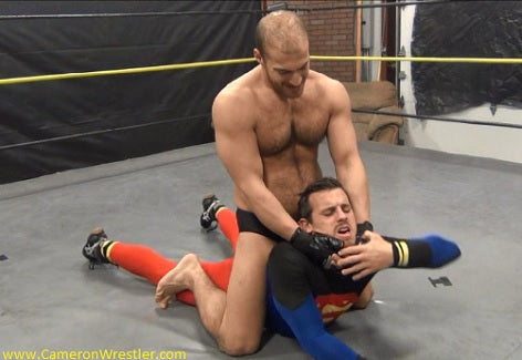 Barefoot, speedo-clad domination on the good looking superhero. Guido has added MMA gloves to his masculine look. Hairy and beefy heel punishes an almost willing jobber.