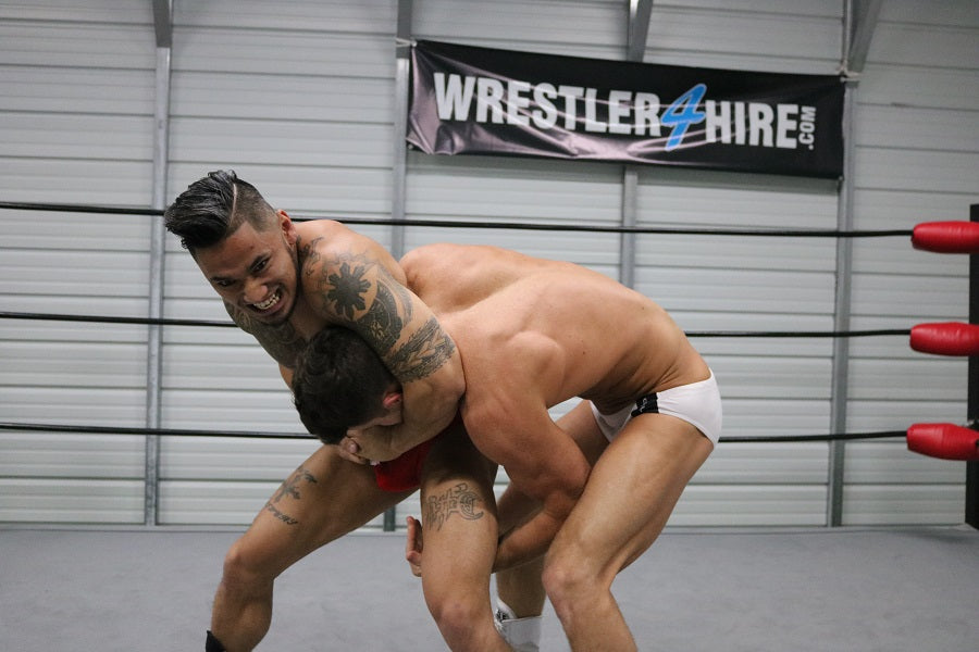 Thorn camels Starr. Blake throws Christian and returns the favor, wrenching him backward and into the trap of his crushing thigh muscles. Sweat begins to drip down their muscular bodies, as Thorn schoolboy pins Starr and forces him into a nasty head-scissor, leaving those lean abs open to some furious gut punching.
