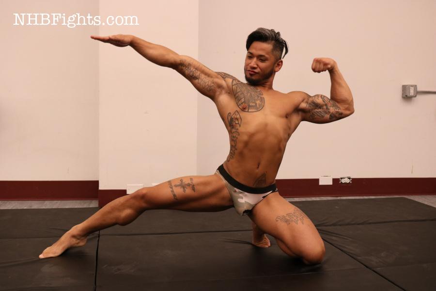 If you’re a long-time fan of the underground wrestling world, you’ve watched Ethan Andrews evolve into a beast in all forums of wrestling, but his best matches are pure NHB. The guy’s grappling is absolutely beautiful to behold. So, pairing him up with an absolutely beautiful opponent like Christian Thorn feels right. Christian uses his stretching session to pose and perform for the camera, flashing that silvery smile and those golden muscles.