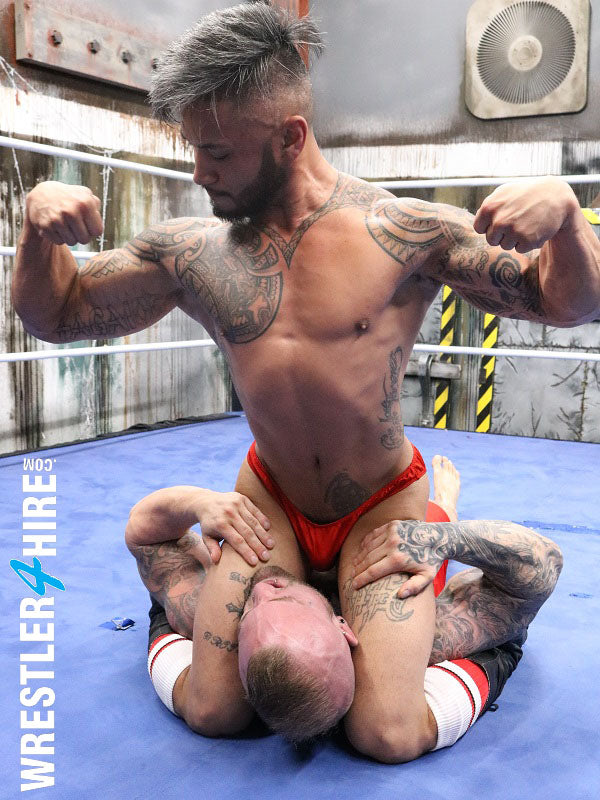 No matter what Christian does, he seems to feel Gunnar hasn't been humiliated enough and keep going back for more. All of Gunnar's massive muscles are worthless in the face of his injury and multiple sleepers from Christian. While Gunnar is out Christian giddily poses him like a rag dog in the most emasculating positions he can think up. Gunnar spends a lot of the match with his face in Christian's crotch. He's also repeatedly dragged to his feet and rolled around. Both men look great and the action is a A+. Can't recommend this enough if you like big muscle guys put in their place