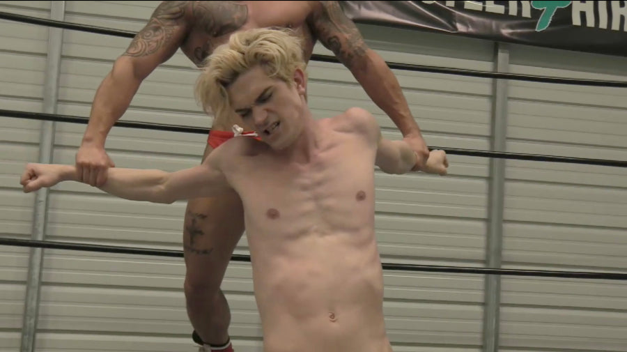 Meet Seth Borden, a friend of a friend I met at a party. He’s a long, lanky dancer, singer, and bartender with a ghostly, almost preternatural beauty. His hair is a mop of pale waves with dark roots, and he wrestles with a very desperate, very sexy aggression that’s unique in all the world. Christian Thorn has a blast dragging this tall, leggy prince all over the floor. His lean limbs kick and flail as he suffers in Thorn’s masterful grip. Seth doesn’t suffer quietly, roaring like a wild animal as wrestling boots tie up and open claws dig into his abdomen.