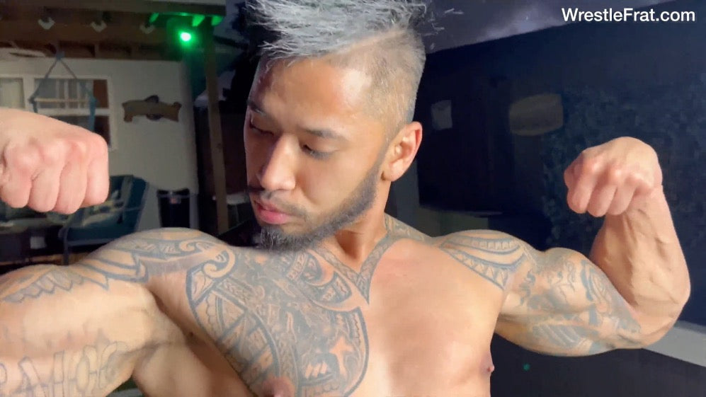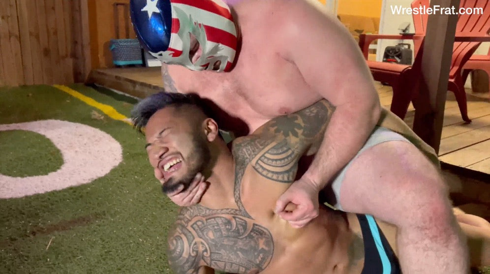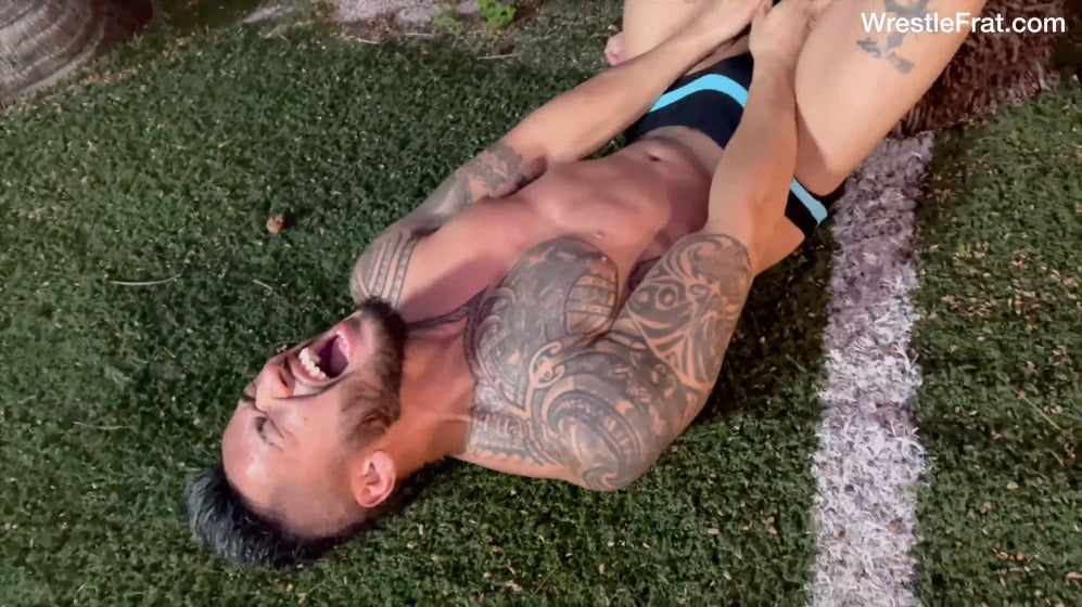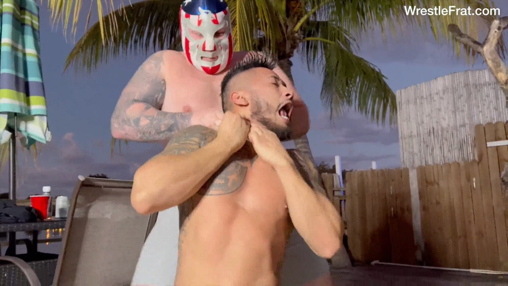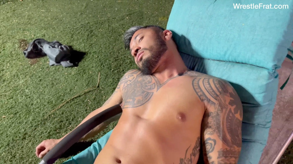 Shatter rams Shawn's nutsack into a palm tree and continues pulling at it until Drew Harper comes in with a fresh soda for the burley man as he is easily in control of the smaller, ripped opponent. Shatter eyes and attacks the beautiful puffy nipples of his buddy and loves every second of it.