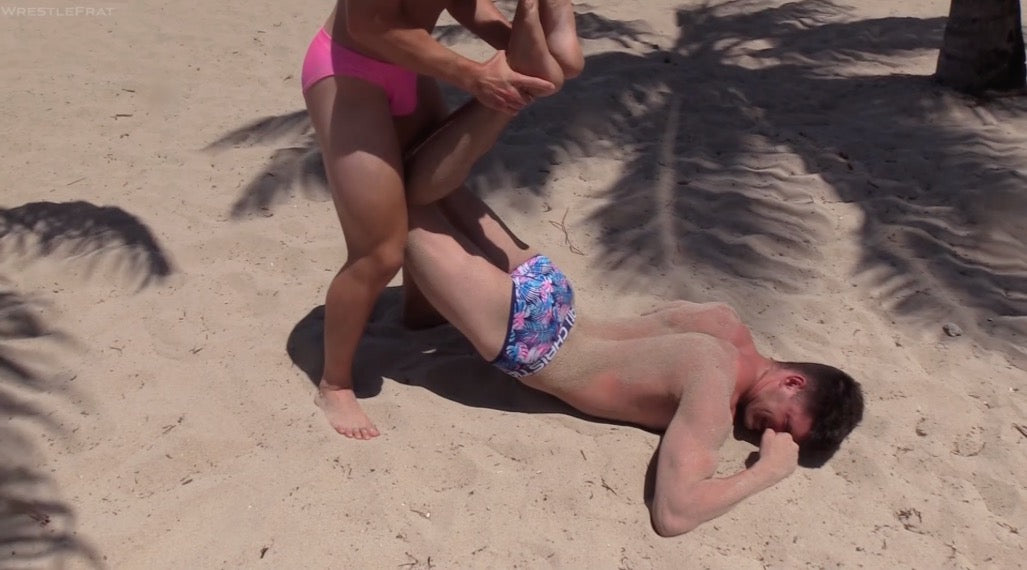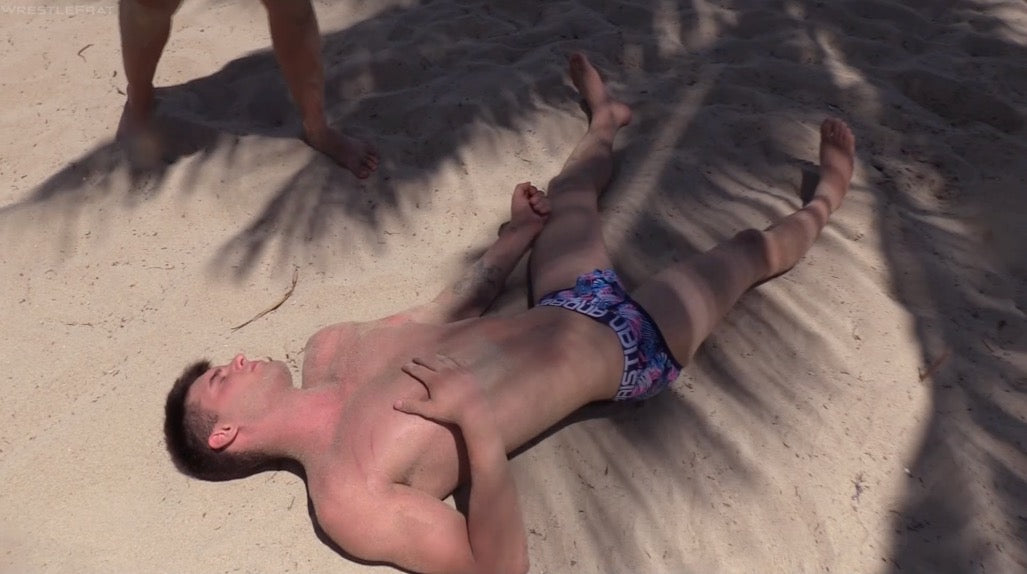 Cal is controlling the taller foe and kicking sand in his face. It's embarrassing. How easily are muscles weakened of their power in the HOT summer sun with cold liquid courage flowing through their veins. Daddy Texas is no match for his friend who seemingly has gotten stronger with his consumption of the beverage.