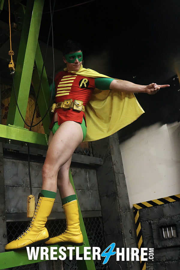 Detective Boy is looking for clues when the Laughing Lunatic sneaks up on him and drowsy dusts him from behind. Suddenly finding himself unconscious, Detective Boy is at the mercy of the maniacal villain. Upon awakening, the Laughing Lunatic uses first the hero’s cape and then his own hand to choke down the helpless hero.