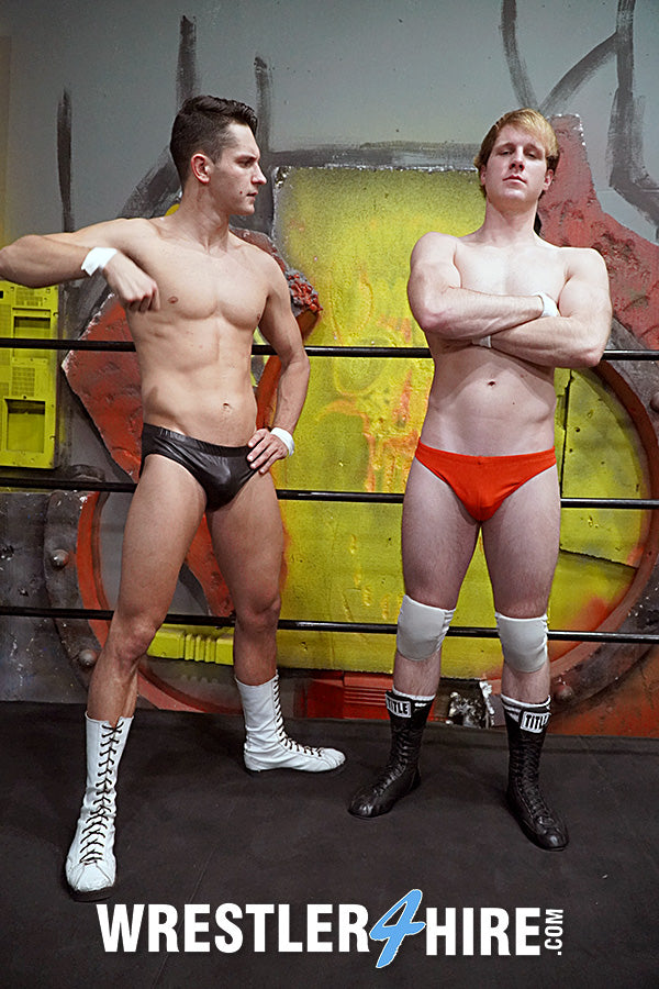 Chad Daniels is a golden-haired hunk...if you like ‘em pale and pensive. In black boots, white knee pads, and miniscule red speedos, he stretches in silence across the ring from cutie loudmouth Dimitri Darkthorn. Dimitri always sounds like the dude who got beat by big brothers who’s trying to make up for it now. He’s aggressive in his trash talk as well as his wrestling style. He even insults Chad’s paleness.