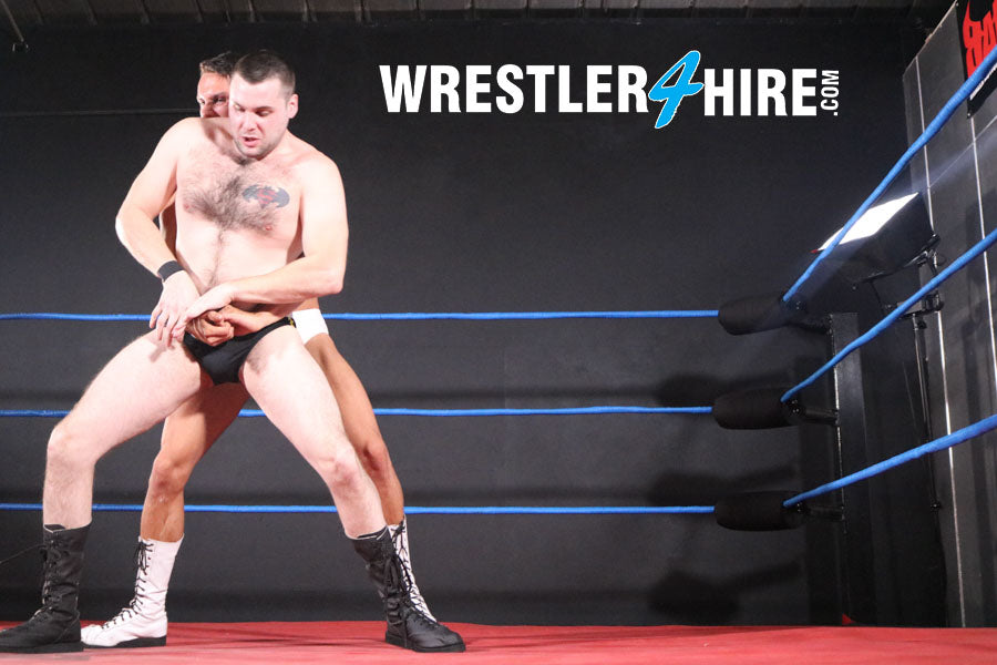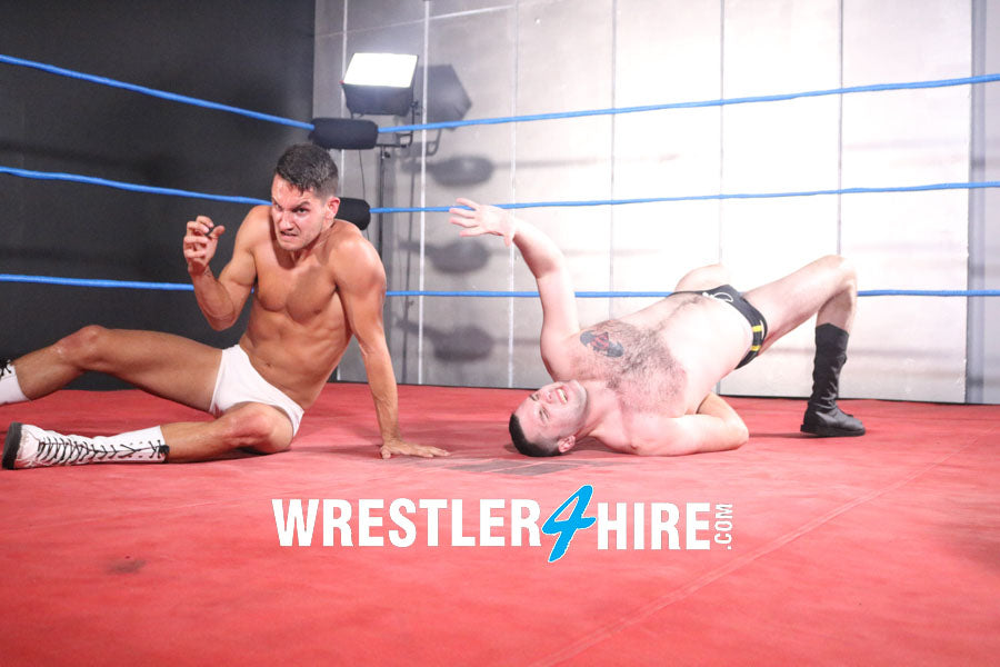 These guys exchange power and position again and again, making it impossible to guess who will come out on top in this surprisingly even match between two very different dudes. Filled with sleepers, nuggies, pins, tangled legs, face slaps, hate filled trash talk, sweat, and so much more. The sweaty slap fight in the middle of the match is a particularly hot highlight!
