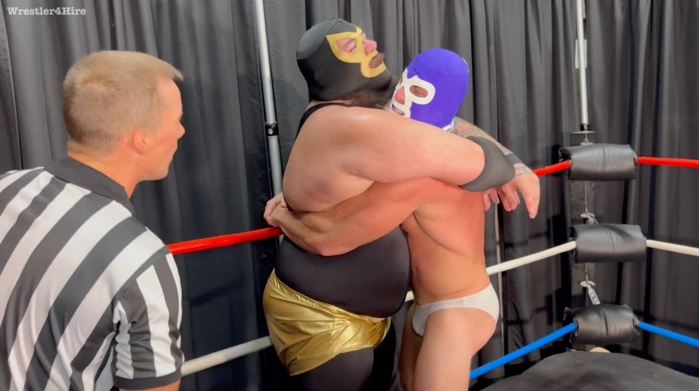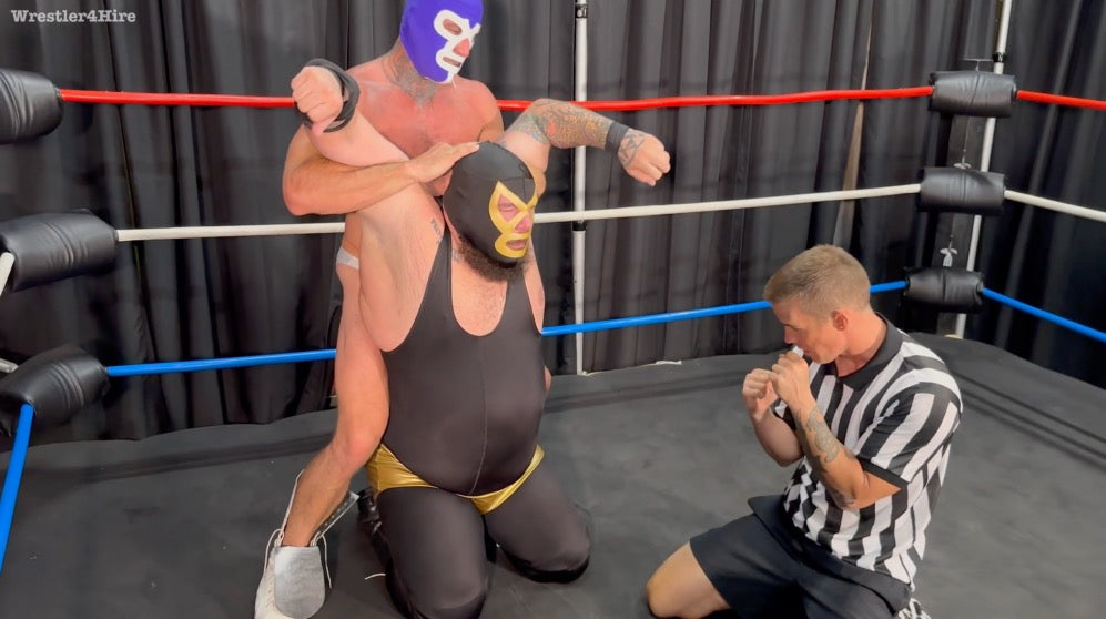 With the referee fully on his side, JT Thunder II teams up with him to brutally beat down and humiliate Golden Terror in a 2-on-1 assault. They try multiple times to force Golden Terror into submission, but despite the overwhelming odds, Golden Terror refuses to give in. The vicious attacks continue, with the referee and JT Thunder II exploiting every opportunity to crush their opponent - including attacks to his groin, eye rakes, thumbs in the bum and creative double-team moves.