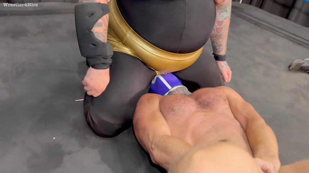 In a powerful comeback, Golden Terror kicks the referee away, rams JT Thunder II and sends him flying out of the ring. The referee, now terrified, begs for mercy, promising to do anything to avoid Golden Terror's wrath. But Golden Terror is relentless. He crushes the referee, pushing him into submission before turning his attention to his masked opposition, who tries to intervene. JT Thunder II is quickly overpowered. He submits to a painful ball claw and front wedgie before being victim of a school boy pin (nuts on the face).