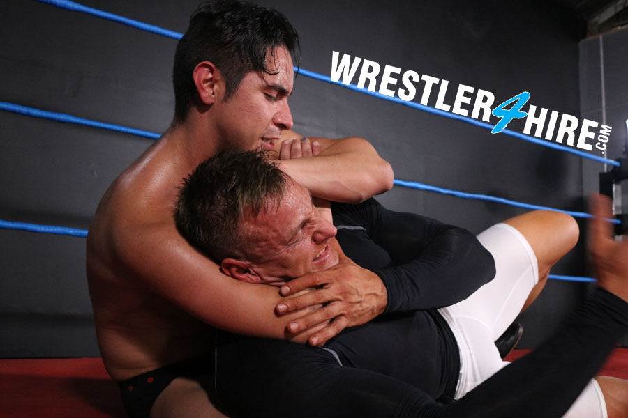 Now the tables have turned, as the scrappy, small stud goes to town on the massive muscle stallion. Drago chokes, gasps, moans, slaps the mat, begs, flops, and endures the stripping away of his shirt...revealing that godlike body in even greater detail. But Reyes is undeterred as he takes his revenge on Drago and every big guy who ever picked on him. “Go to sleep!” roars Reyes through gritted teeth...and that’s only five minutes into this sweaty, surprising, athletic exhibition of humiliation, fantasy, and one beautiful jobber reigning supreme!
