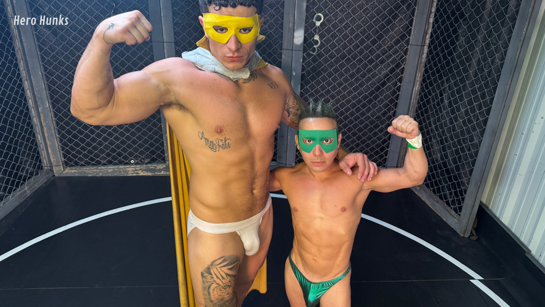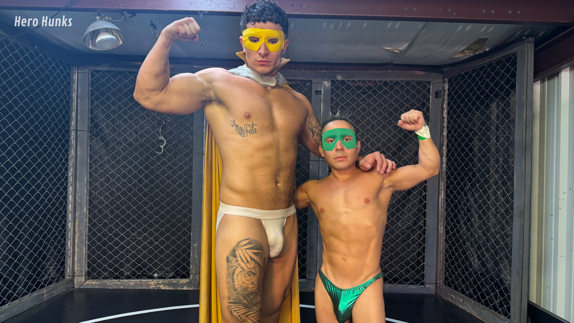 What Sunburst doesn’t realize is that Emerald Admirer is deceivingly powerful and he knows Sunburst secret weakness. With each piece of the hero’s uniform stripped away—Sunburst’s power drains. The bigger hero tries to stay in control, grinding his bulge across Emerald Admirer’s chin, flexing and smothering him with muscled dominance. But Emerald Admirer laughs through it, reversing the action with dirty tactics—Tickling, ball claws, and dirty leverage keep Sunburst struggling to maintain control.