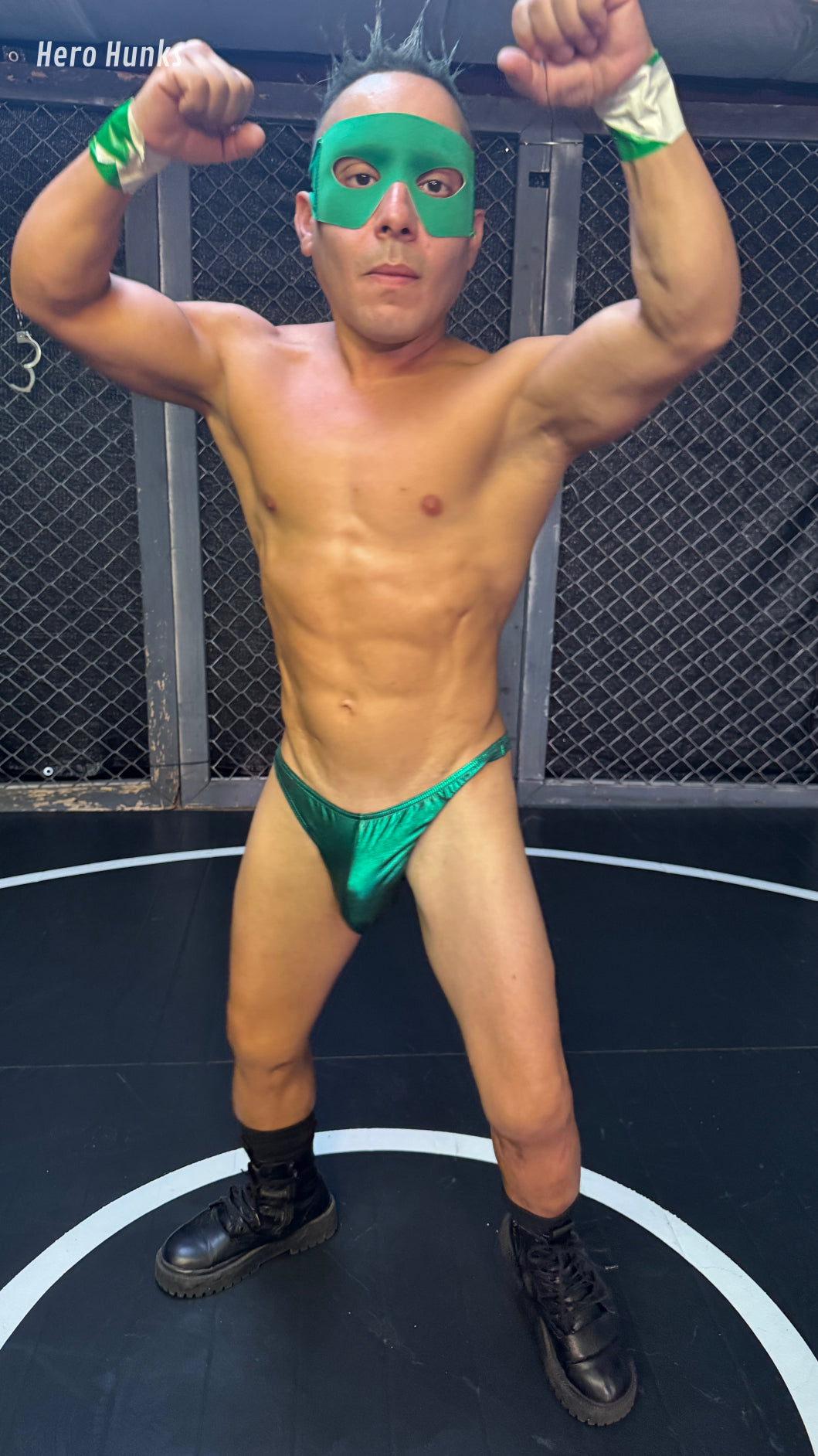 Sunburst (played by Amino) finds himself chained to a rusty warehouse fence, muscles flexing and glistening with sweat. He doesn’t know how he got there, but the sound of mocking laughter gives him a clue—Emerald Admirer (played by Ricky Vegas), the smirking, devilish micro villain, steps into view. Emerald Admirer circles like a cat with its prey, soaking in the sight of the captured hero. But Sunburst isn’t one to just take it—he rips free of the cuffs and charges, ready to humiliate this pint-sized menace.