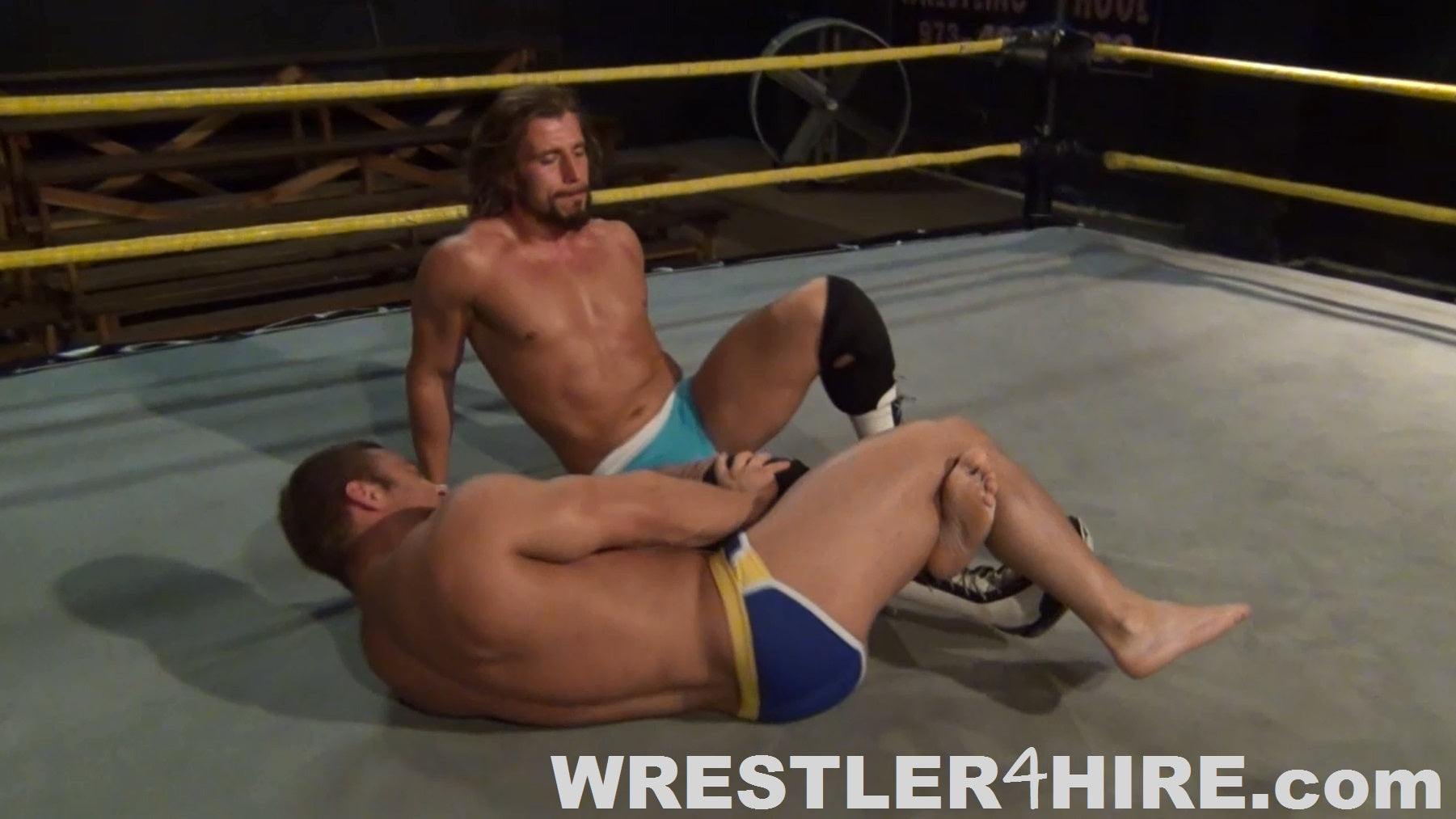 Enter long-haired Garrett Thomas, a professional if there ever was one, in teal trunks, ready to teach the greenhorn a lesson. Like so many before him, the pro is taken in by the barefoot rookie’s cute face and earnest attitude, a mistake he pays for by being crushed like a nut between Angel’s thighs. Looks like Thomas has his work cut out for him.