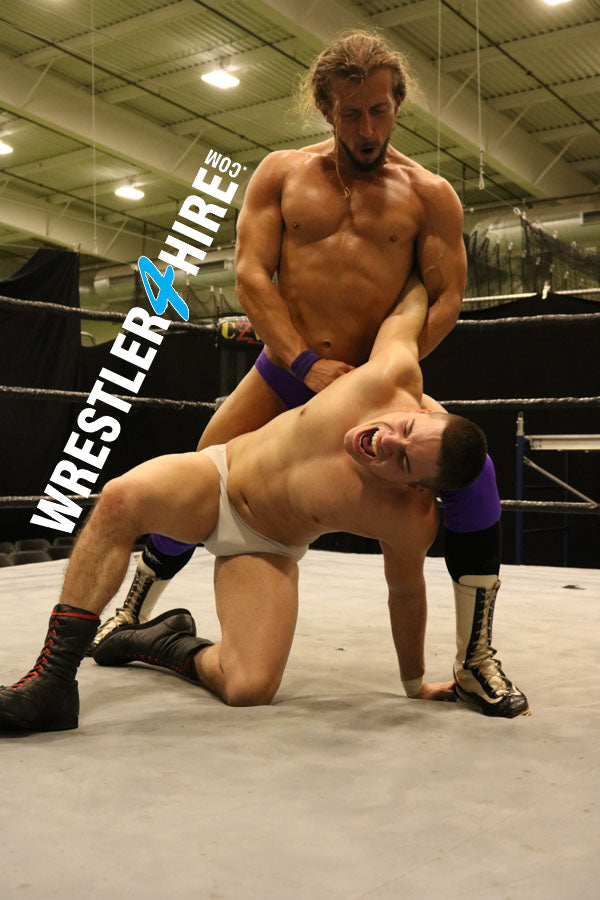 “Think you’re in shape now?” asks musclebound Garrett. The Boss Hog challenges Vinny to a sad flexoff, calling him “the little boy” (hey, the nickname fits!), and politely asking Vinny to send in a more muscular opponent. Vinny’s feelings are hurt, and he lashes out at Garrett...only to get slammed through the mat! Get ready for a gravity defying, athletic, epic ass kicking. Vinny is hoisted off his boots and hurtled through the air again and again, until he finds his head trapped between Garrett’s thighs. With every flex, Vinny screams with pain.