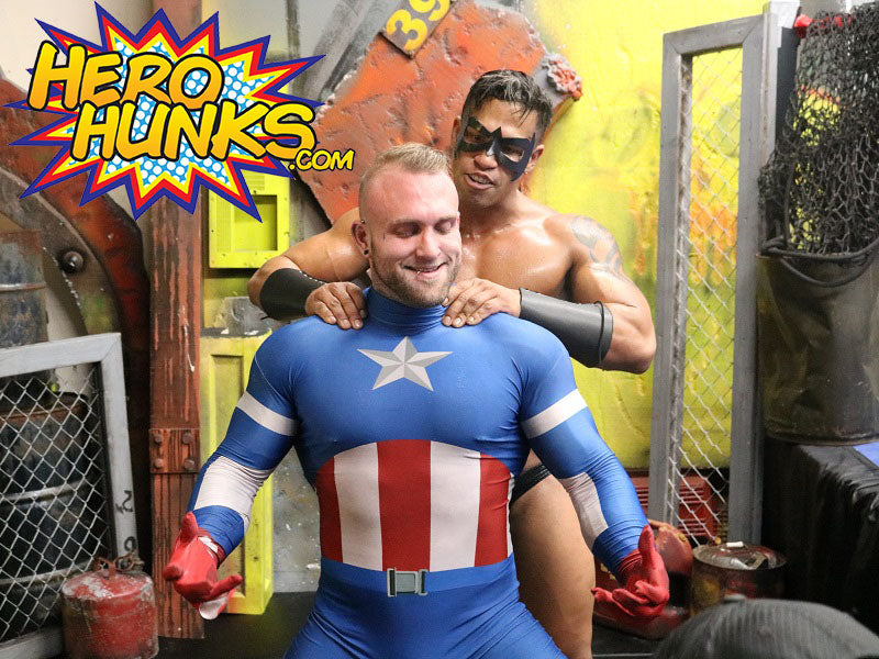 Green Guardian calls out in despair when he realizes that his best friend is now completely controlled by Mysterion. Super Soldier is no more! The villain demands that he destroy his former friend, and they release him from his ropes and begin a arsenal of destruction! They slam him over their knees, and continually make our hero’s abs a target for super punches!