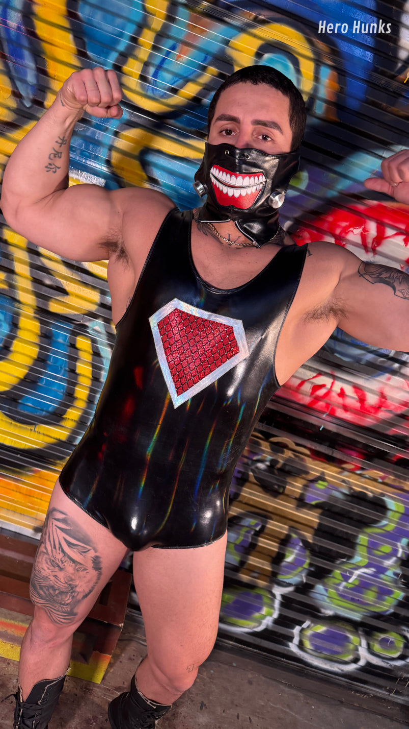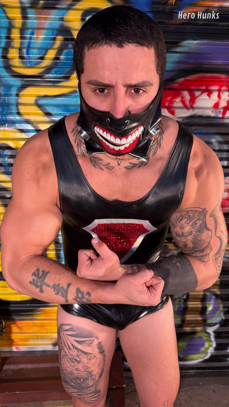 Handsome hero Red Jay (played by Roswell) is chained up and struggling to regain his senses. Silently Enter Big Muscled Bad Boy, Rictus (played by Amino). He's focused and deliberate - wasting no time jumping into action. Pounding his fists playfully into the ripped abs of Red Jay. He claws deep into the flesh of his chained up play-thing.