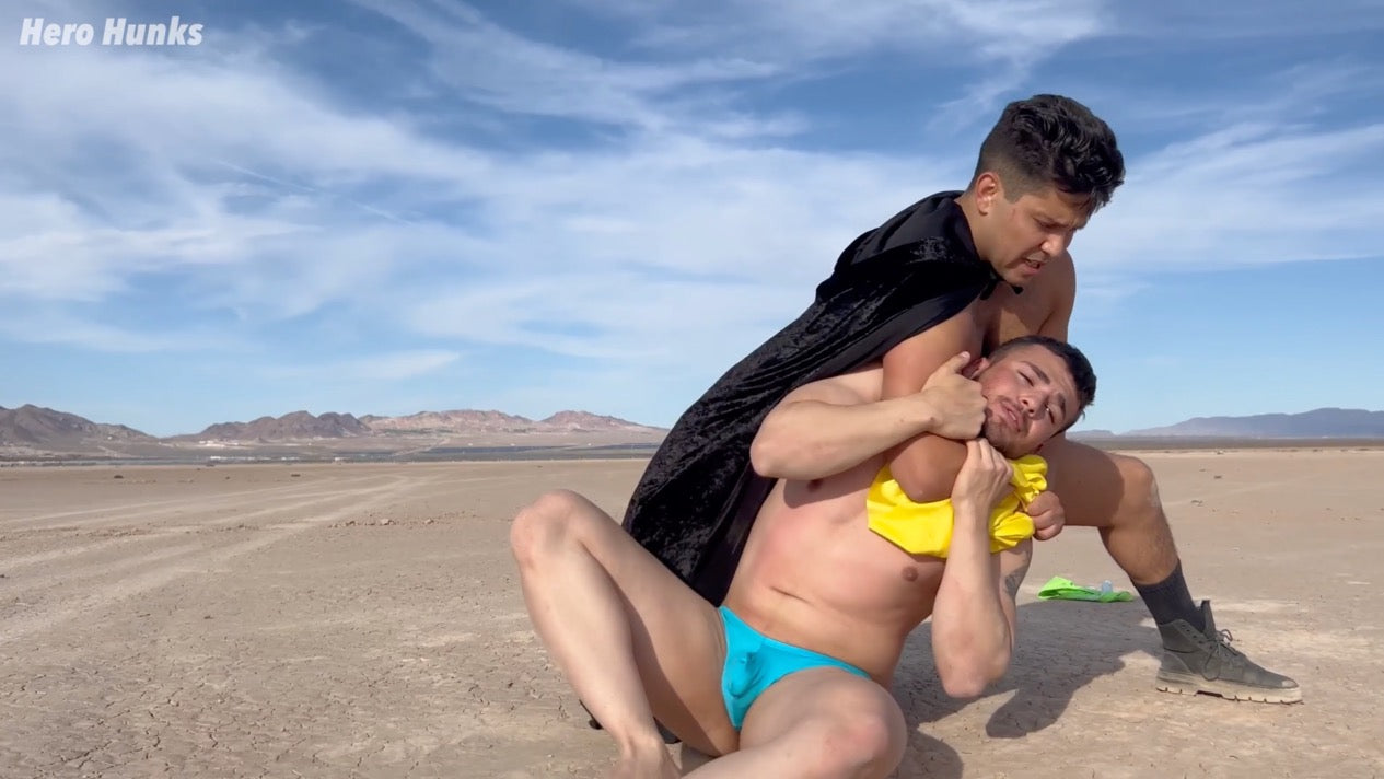 As if defeat weren’t enough, Daddy X strips Neon out of his lime-green superhero trunks, revealing a snug sky-blue thong underneath—a final insult to injury. What follows is pure humiliation, as Daddy X toys with his bound and beaten prize, dragging out every moment of control and teasing torment.