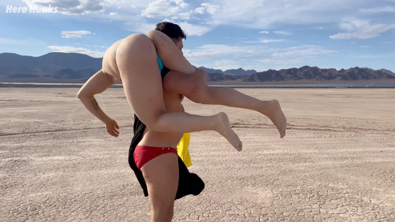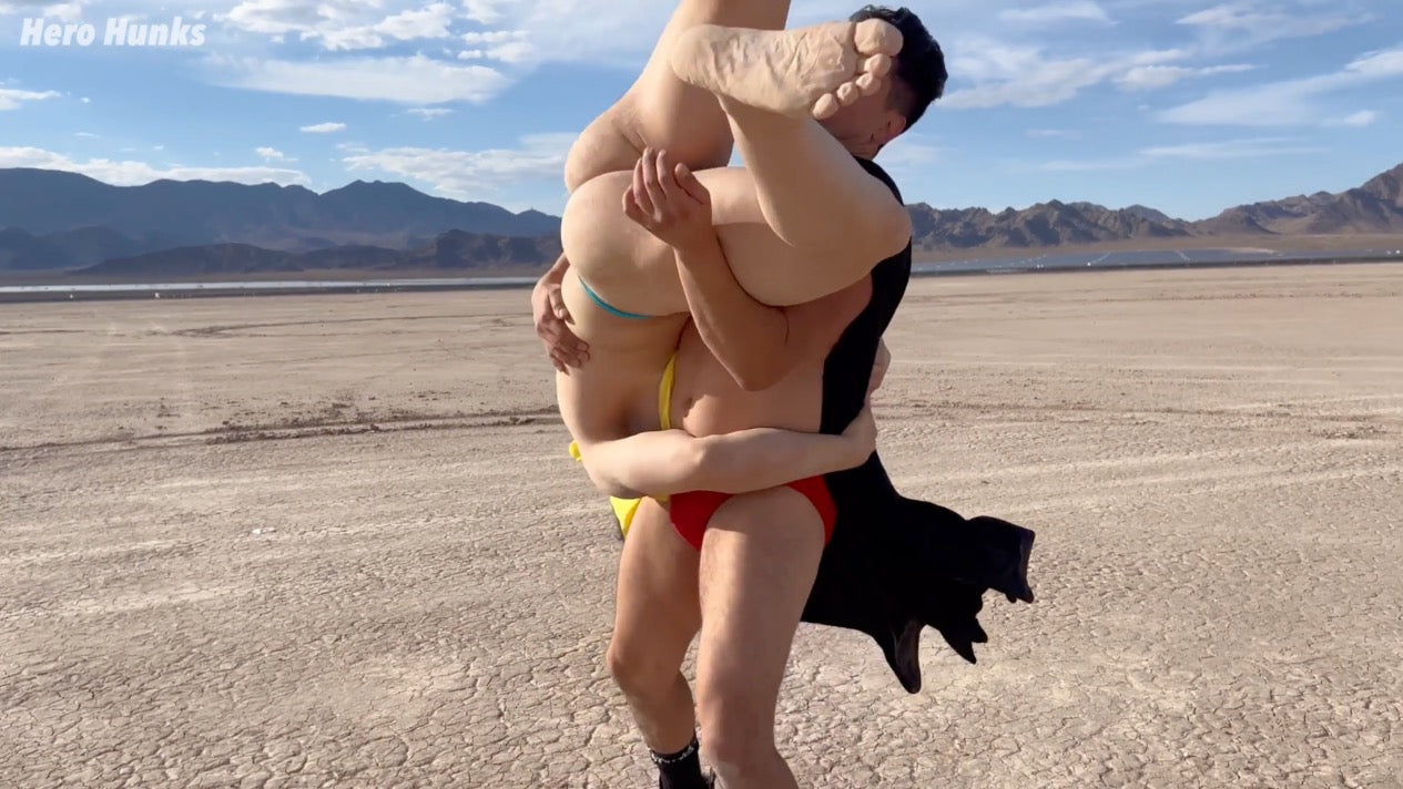 With a smirk and a cruel gleam in his eye, Daddy X wastes no time overpowering the exhausted hero. Bone-crushing slams, brutal headlocks, and stifling sleeper holds stretch and bend Neon Flux into helpless positions, his smooth, glistening body framed against the wide blue sky. The domination is pure art, and Daddy X knows it. He reaches down and grabs a heavy handful between the hero’s legs, squeezing hard as Flux moans in agony and shame.