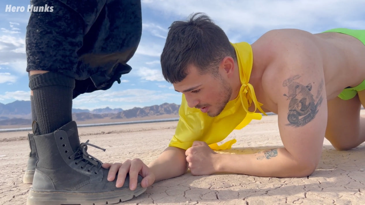 Neon Flux is crawling—hands and knees through the blistering desert, his body aching, his spirit cracked after his brutal defeat by Dark Force in Part 1. The sun blazes above, and the endless sands offer no mercy… until he stumbles upon a pair of worn boots planted firmly in the dirt. Salvation? Not quite. As his eyes rise, hope quickly fades. He’s found not a savior—but Daddy X, the twisted desert deviant with a hunger for control.